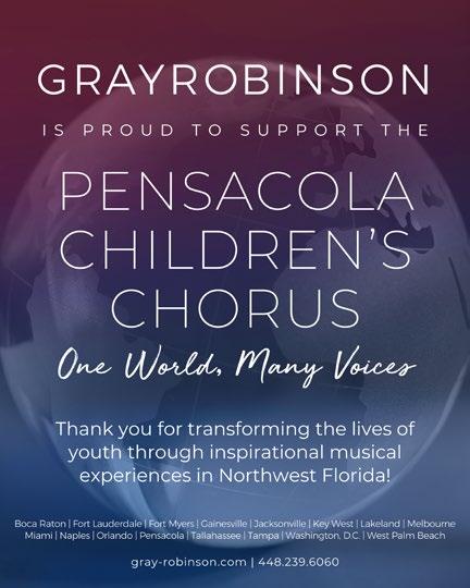On behalf of the Board of Directors of the Pensacola Children’s Chorus, I am honored to extend a warm welcome to you as you join us for our midseason concert—One World, Many Voices. This uplifting event highlights choral singing, the artistic heart of PCC. Enjoy the beauty and excitement that is created as our young singers unite their voices together in a traditional choral setting.