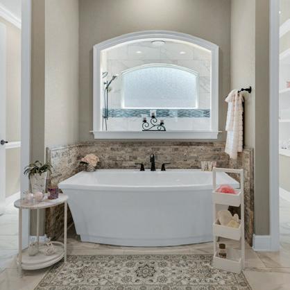 Make it Spa-Like: Lavish luxury is the goal with a spa-like bathroom in the comfort of home. Organic materials, natural light, traditional decor and, maybe most importantly, an oversized soaking tub are at the core of this look. While it may sound counterintuitive, you can actually create your own oasis with some simple, budgetfriendly aesthetics. The first step for many is to incorporate more storage using sleek cabinets, shelves and wall-mounted hooks to achieve a decluttered look. Next, simply replace your old showerhead and faucet with spa lookalikes and stock up on plush, fluffy towels for that luxurious appearance without a complete remodel. Find more design inspiration by visiting Wellborn.com.