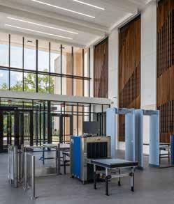 large lobby and two x-ray machines are present for scanning personal belongings and deliveries. Security monitoring capabilities inside and outside the building far exceed those at the old facility. One of the most significant improvements at the new courthouse is the secure pathway of travel/access for incarcerated individuals. As many know, those incarcerated individuals transported to the old courthouse walked the same hallways simultaneously with the public, staff and judges.