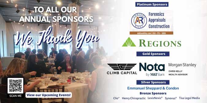 THE SUMMATIONWeekly Owner Malcolm Ballinger Publisher Malcolm Ballinger malcolm@ballingerpublishing.com The Summation Weekly Administrator Darien Hardy, Ext. 25 legals@ballingerpublishing.com Associate Editor Darien Hardy, Ext. 25 legals@ballingerpublishing.com Website www.summationweekly.com Editorial Offices 21 E. Garden St., Ste. 205 Pensacola, FL 32502 850.433.1166 Fax 850.435.9174 Office Hours Monday–Friday 8:30 am–5 pm Published every Wednesday USPS Publication Number 16300, Authorized August 25, 2015 (Pensacola, FL) Subscription Rates $20/year (All ESRBA Members) $22.50/Year (Escambia/Santa Rosa/ Okaloosa County Non-Members) $27.50/Year (other counties within Florida & all other states NonMembers) Postmaster Send address changes to: 21 E. Garden St., Ste. 205 Pensacola, FL 32502 Executive Director Jeff Nall jeff@esrba.com Member Services Coordinator Stephen Hayward stephen@esrba.com Bar Office 260 S. Tarragona Street, Suite 160 Pensacola, FL 32502 Bar Office Phone: 434.8135 Email: esrba@esrba.cm Website: www.esrba.com The Summation Weekly is locally owned and operated. All Rights Reserved. Reproduction or use of the contents herein is prohibited without written permission from the publisher. Comments and opinions expressed in this newspaper represent the personal views of the individuals to whom they are attributed and/or the person identified as the author of the article, and they are not necessarily those of the ESRBA or the publisher. This newspaper accepts no responsibility for these opinions. The ESRBA reserves the right to edit all manuscripts. All advertising information is the responsibility of the individual advertiser. Appearance in this newspaper does not necessarily reflect endorsement of any products or services by Escambia/Santa Rosa Bar Association or Ballinger Publishing. © 2023 Published by Ballinger Publishing for the Escambia-Santa Rosa Bar Association. RECEIVE SUMMATION WEEKLY AT YOUR OFFICE OR HOME CALL DARIEN HARDY AT 433-1166 EXT 25 OR EMAIL HER AT LEGALS@ BALLINGERPUBLISHING.COM SUBSCRIPTION RATES $20/YEAR ALL ESRBA MEMBERS $22.50/YEAR ESCAMBIA/ SANTA ROSA/OKALOOSA COUNTY NON-MEMBERS $27.50/YEAR OTHER COUNTIES WITHIN FLORIDA & ALL OTHER STATES NON-MEMBERS