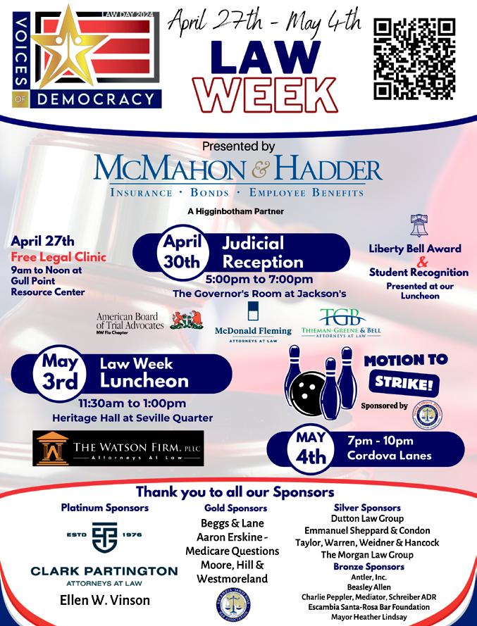 THE SUMMATIONWeekly Owner Malcolm Ballinger Publisher Malcolm Ballinger malcolm@ballingerpublishing.com The Summation Weekly Administrator Darien Hardy, Ext. 25 legals@ballingerpublishing.com Associate Editor Darien Hardy, Ext. 25 legals@ballingerpublishing.com Website www.summationweekly.com Editorial Offices 21 E. Garden St., Ste. 205 Pensacola, FL 32502 850.433.1166 Fax 850.435.9174 Office Hours Monday–Friday 8:30 am–5 pm Published every Wednesday USPS Publication Number 16300, Authorized August 25, 2015 (Pensacola, FL) Subscription Rates $20/year (All ESRBA Members) $22.50/Year (Escambia/Santa Rosa/ Okaloosa County Non-Members) $27.50/Year (other counties within Florida & all other states NonMembers) Postmaster Send address changes to: 21 E. Garden St., Ste. 205 Pensacola, FL 32502 Executive Director Jeff Nall jeff@esrba.com Member Services Coordinator Stephen Hayward stephen@esrba.com Bar Office 260 S. Tarragona Street, Suite 160 Pensacola, FL 32502 Bar Office Phone: 434.8135 Email: esrba@esrba.cm Website: www.esrba.com The Summation Weekly is locally owned and operated. All Rights Reserved. Reproduction or use of the contents herein is prohibited without written permission from the publisher. Comments and opinions expressed in this newspaper represent the personal views of the individuals to whom they are attributed and/or the person identified as the author of the article, and they are not necessarily those of the ESRBA or the publisher. This newspaper accepts no responsibility for these opinions. The ESRBA reserves the right to edit all manuscripts. All advertising information is the responsibility of the individual advertiser. Appearance in this newspaper does not necessarily reflect endorsement of any products or services by Escambia/Santa Rosa Bar Association or Ballinger Publishing. © 2023 Published by Ballinger Publishing for the Escambia-Santa Rosa Bar Association. RECEIVE SUMMATION WEEKLY AT YOUR OFFICE OR HOME CALL DARIEN HARDY AT 433-1166 EXT 25 OR EMAIL HER AT LEGALS@ BALLINGERPUBLISHING.COM SUBSCRIPTION RATES $20/YEAR ALL ESRBA MEMBERS $22.50/YEAR ESCAMBIA/ SANTA ROSA/OKALOOSA COUNTY NON-MEMBERS $27.50/YEAR OTHER COUNTIES WITHIN FLORIDA & ALL OTHER STATES NON-MEMBERS