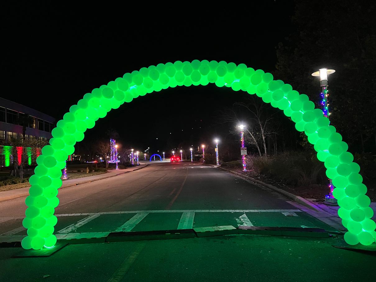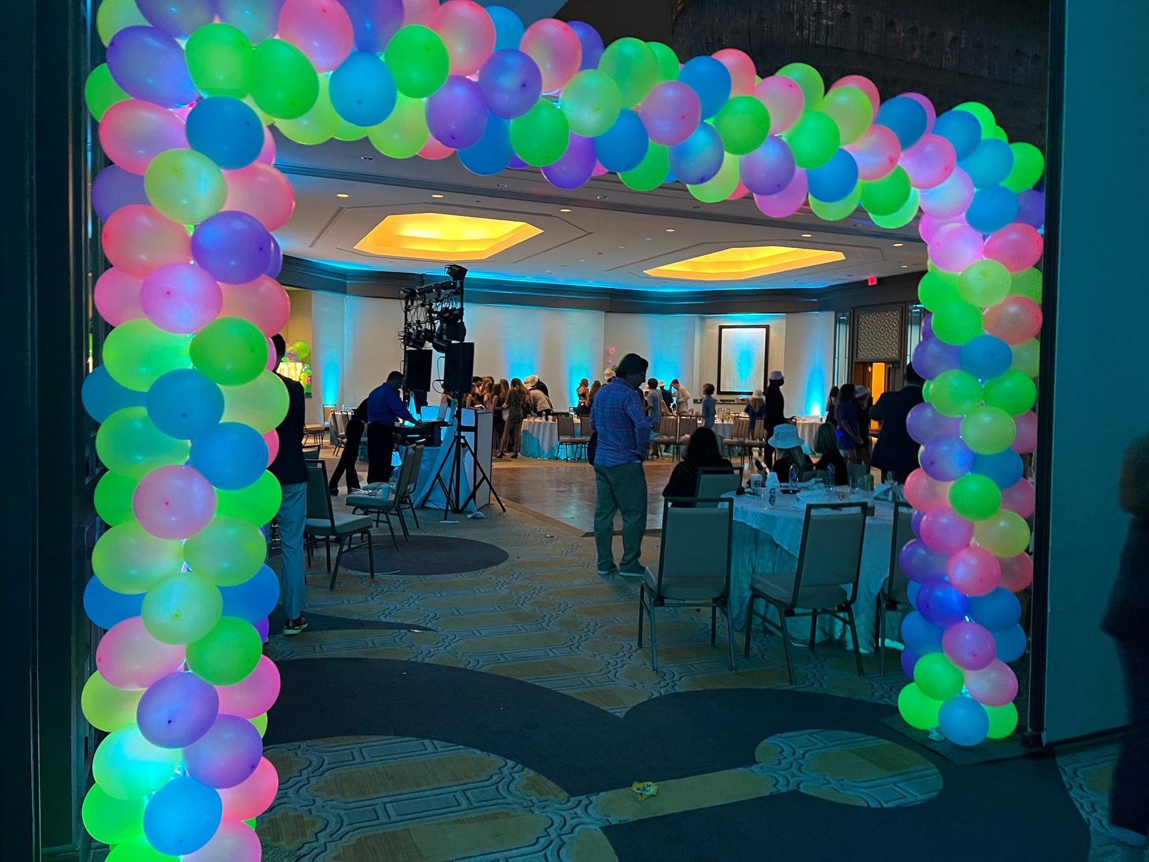 Lighted Balloon Arches! 10' by 12' Medium $400.00 12' by 15' Jumbo $500.00 White balloon arch illumnated to make a your event glow! Lights have the options to chase and move for an amazing special effect!