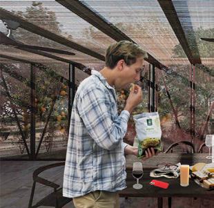 Los clientes necesitaban algún lugar para protegerse del sol y el viento en su jardín. la propuesta era un espacio polivalente en esas condiciones. la idea es que tú controlas como quieras la comodidad de la situación. Es una construcción ligera que utiliza una estructura de acero y un tejido plástico para controlar la atmósfera y hacer posibilidades de ver hacia el otro lado, como una lámpara. Un artefacto para dejar todo cerrado y abierto a necesidad, por habitabilidad u seguridad.
