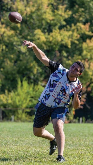 Y&L QB Dan Gutman led an impressive opening drive capped by a slant touchdown to Eitan Rock, followed by a two-point conversion to WR Mordy Reches. From there, Y&L’s defense took over. Gedalia Gelb wreaked havoc in the backfield, forcing a bad throw that was picked off by Aron “Lefky” Lefkowitz. Gutman wasted no time capitalizing, finding Reches again for a pump-andgo touchdown and a 14–0 lead.