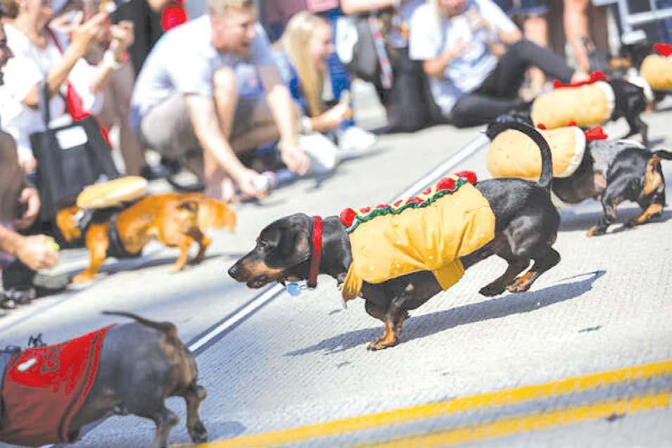 One hundred dachshunds, all dressed in hot dog bun costumes, line up at the start to race.