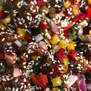Prepare the salad. Place veggies into a large, wide bowl; add warm rice. Toss to combine. Dress salad with Best Caesar Dressing Ever (you may have extra).