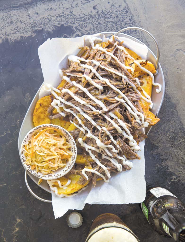 10. Assemble the brisket fries: Arrange potatoes on a platter. Top with pulled brisket; drizzle with Garlic mayo.