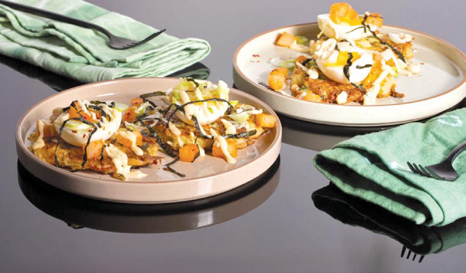 1. Top each rice cake with some store-bought kimchi and a jammy egg and finish with scallions, chili flakes, and finely cut nori flakes or furikake seasoning.
