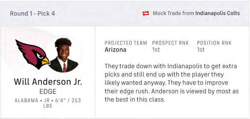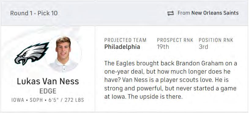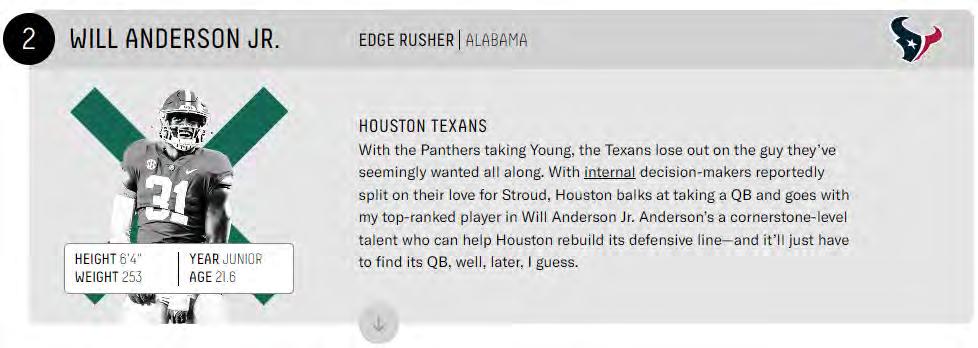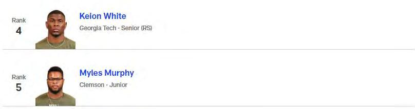 This year's edge crop features an intriguing collection of sack artists and disruptive playmakers. Anderson is the big gest prize as a high-energy defender with A+ athleticism and pass-rush skills. He's a monster off the edge with the tools that should help him blossom into a double- digit sack artist early in his NFL career. Wilson is a heavy-handed power rusher with outstanding size and length. The Texas Tech product is a disruptive force at the line of scrimmage with rock-solid skills as a run defender and pass rusher. Van Ness is a versatile front-line defender with a high-revving motor that overwhelms opponents. The Iowa standout offers position flexibility and is a rugged player at the point of attack with outstanding skills as a run stopper/pass rusher. White plays like a bull in a china shop, utilizing an assortment of power maneuvers to create chaos in the backfield. The Georgia Tech standout overwhelms blockers with his relentless approach and non-stop energy. Murphy is an explosive edge defender with outstanding snap-count anticipation and first-step quickness. The Clemson star is a natural pass rusher with the bend-and-burst ability to develop into an annual doubledigit sack producer.