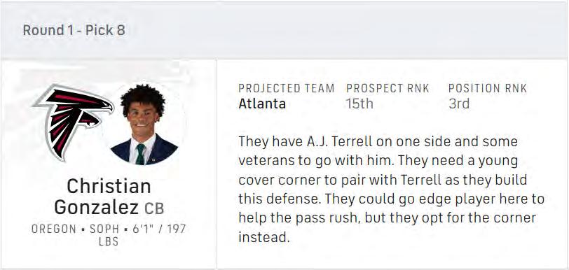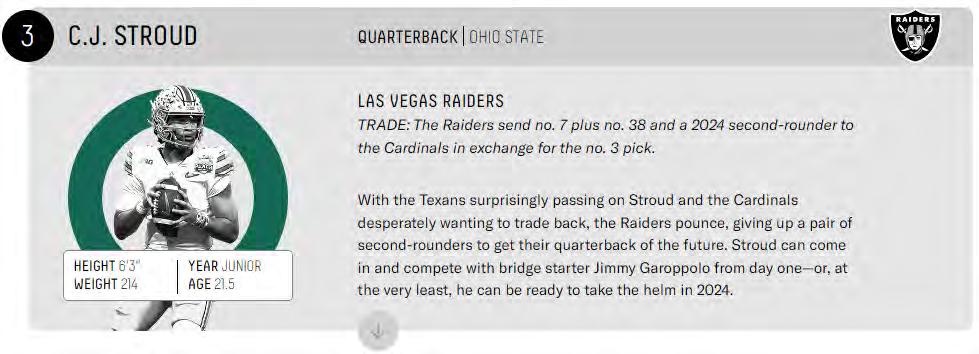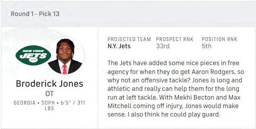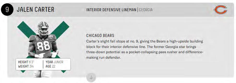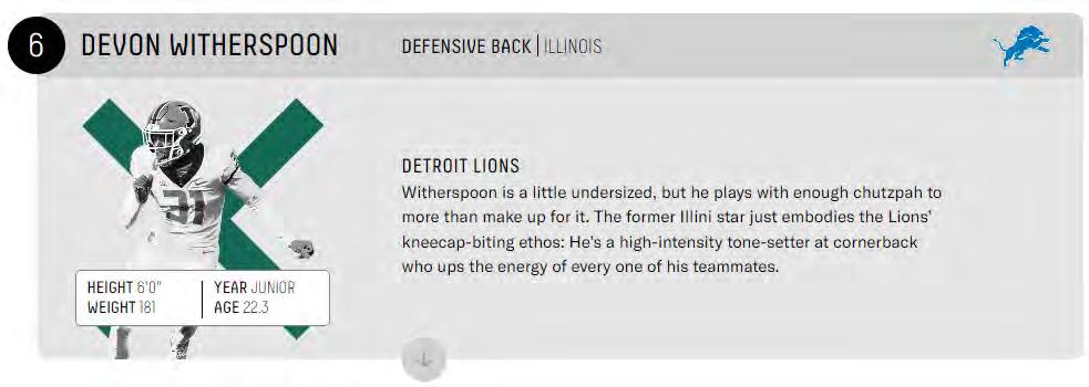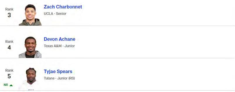 This RB class is loaded with potential starters, many of whom could come off the board in the middle rounds, given the devaluation of the position in the draft hierarchy. As the undisputed RB1 of the class, Robinson is a five-star player with top10 talent and potential. The Texas standout is an old-school runner with the vision, balance, body control and power to run through or around defenders, and he flashes the ability to score from anywhere on the field. Gibbs is a jitterbug with dangerous stop-start quickness and burst. The Georgia Tech/Alabama product is a big-play machine with diverse skills to immediately excel as a change-of-pace/third-down back in the NFL. Charbonnet is a super-sized back with a throwback game. The UCLA star is a punishing runner with the vision, balance and body control to weave through traffic as a classic RB1. Achane is a lightweight playmaker with explosive quickness, acceleration and long speed. Although he lacks the size to handle a heavy workload in the NFL, the Texas A&M product could make a profound impact as a third-down back in a spread offense. Spears is the electric backfield playmaker that every offense could use. The Tulane star displays stellar stop-start quickness, as well as ballerina-like balance and body control with the ball in his hands.