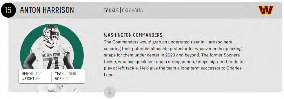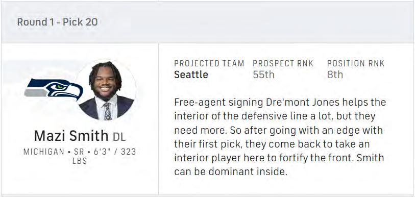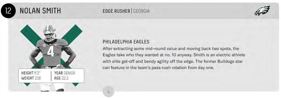 Seeking tackling machines with outstanding instincts and high football IQs? You've come to the right place! Sanders is a throwback linebacker with the size, strength and awareness to control the middle. With the Alabama/Arkansas product also displaying disruptive pass-rush skills, defensive coordinators will salivate over his potential as an impactful secondlevel defender. Smith is a standup edge defender with the versatility to play multiple spots on the second level. The Georgia star could fill a void as a DPR (designated pass rusher) or play in the box as a run-and-chase defender. With unique traits and rare athleticism, the combine star is surging up the charts. Simpson is an athletic playmaker with outstanding instincts and awareness. The Clemson star is a rangy defender with the speed and quickness to run with tight ends down the seam or attack the quarterback off the edges. Campbell is an old- school thumper with the instincts, range and diagnostic skills to own the tackle-to-tackle box. He has a strong nose for the ball, with a knack for taking it away as a run stopper/pass defender. To'oTo'o is an instinctive playmaker with a knack for finding the ball in traffic. The Alabama product is a tackling machine with the requisite sideline-to-sideline range to make plays inside and outside of the box.