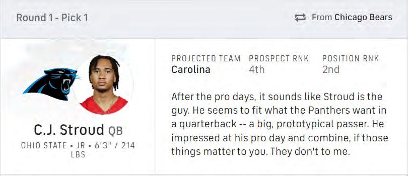 While lacking a high-end prospect with Ja'Marr Chase-like potential, this year's wide receiver pool features a collection of intriguing pass catchers with polished games. Smith-Njigba is a blue-chipper with the skills to emerge in the NFL as a bigplay specialist from the slot. Although he missed most of 2022 with a nagging hamstring injury, the Ohio State product checks off all of the boxes as a pass catcher with high-end potential on Sundays. Flowers is an explosive catch-and-run specialist with the speed and quickness to overwhelm defenders in one-on-one matchups. The Boston College standout is an A+ route runner with a dynamic game that could make him a nightmare to defend in the NFL. Johnston is a big, fast and physical playmaker with a knack for producing big gains on the perimeter. The TCU product is a bit of a body catcher, but his leaping ability and length make him a dangerous weapon on the outside in a vertical passing game. Addison is a route-running specialist with impeccable timing and precision. The 2021 Biletnikoff Award winner is a tough matchup on the perimeter as a versatile playmaker who can win from the slot or out wide. Hyatt is a speed demon with a knack for scoring touchdowns and delivering big plays. Although he is a bit of a one-trick pony with a limited route tree, the 2022 Biletnikoff Award winner is a vertical-stretch weapon with outstanding speed, quickness and burst.