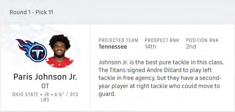 Baltimore's scouting staff always talks about taking the “highestrated player on our board” when it comes time to select a player. The Ravens’ history proves that. When it had a Pro Bowl left tackle with Tony Jones, Baltimore selected Hall of Famer Jonathan Ogden, who was the first pick (fourth overall in ’96) in team history. When the Ravens had Pro Bowl players like Priest Holmes, Shannon Sharpe and Mark Ingram II, the Ravens selected Jamal Lewis and Todd Heap in the first round and Dobbins in the second.