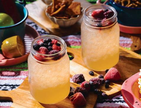 3. Pour into ice-filled glasses and top with frozen berries.