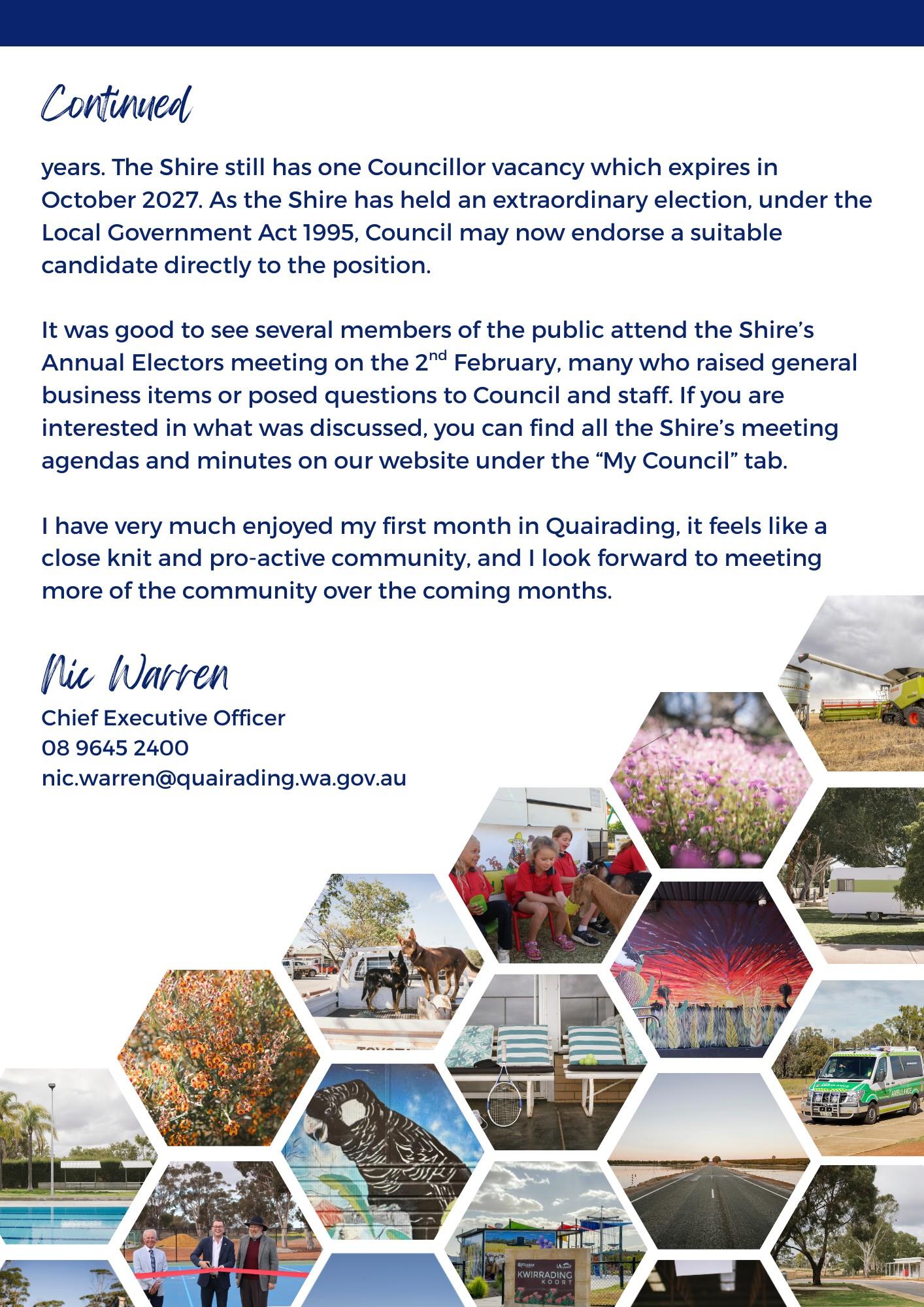 au or call (08) 9645 2400. For full details and selection criteria, view the Application Package via our website: https:// www.quairading.wa.gov.au/mycouncil/employment/