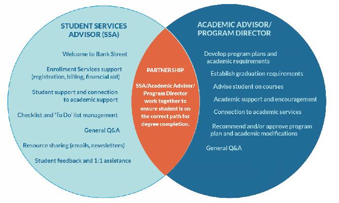 Our Student Services Advisors (SSA) are here for you every step of the way, starting with answering any questions you have in registering for your first semester of classes. Your SSA will assist you in knowing when and how to register for classes, accessing and accepting your financial aid, understanding your bill and knowing when payments are due, and more! They’ll connect with you throughout the semester to check in and see how you are doing from the moment you start at Bank Street until you graduate. They’ll provide you with a biweekly newsletter chock full of resources like upcoming events, deadline reminders, and tips and tricks for student success.