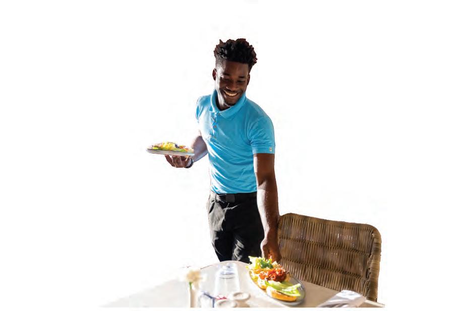 locally sourced ingredients. Start your journey with inventive appetisers like barracuda ceviche, where citrus-marinated local fish is paired with avocado and coconut milk—a bright, refreshing dish that brings the flavours of the Caribbean to life. For a taste of reimagined local comfort food, try the ox-tail and plantain patty with cinnamoninfused vegetable chutney and tamarind sauce, a unique offering that reflects both tradition and innovation.