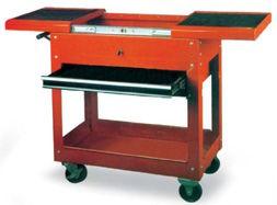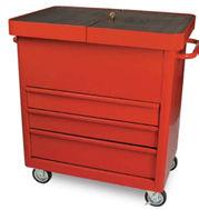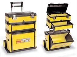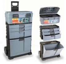 tura con chiave e cinghia a tracolla; base 370 x 220 x 445 h mm con portautensili con scomparti, vano interno con sponda ribaltabile e serratura con chiave. •Due ruote in gomma per il trasporto.