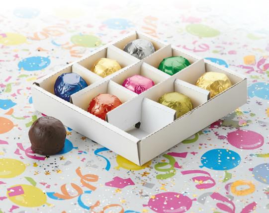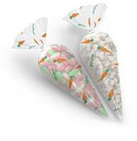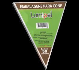 Embalagens para cone trufado de chocolate, disponíveis em diferentes cores, modelos e padrões. Inclui também opções transparentes para doces e balas.