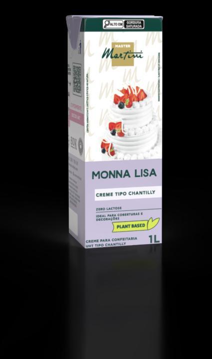 Monna lisa é um chantilly UHT sem lactose e plant based, sabor baunilha. Excelente para coberturas em bolos que precisem de um acabamento mais delicado e fino.