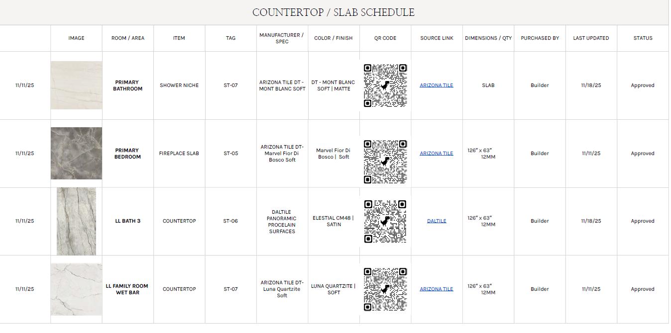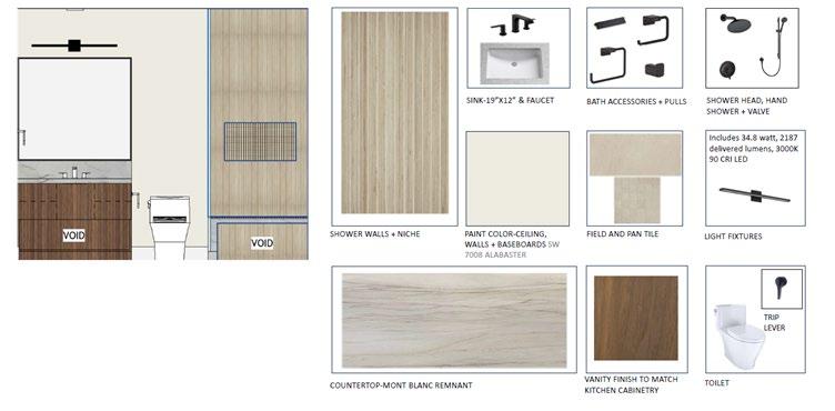 • Includes cabinetry design, bathroom elevations, tile, countertops, hardware, and plumbing