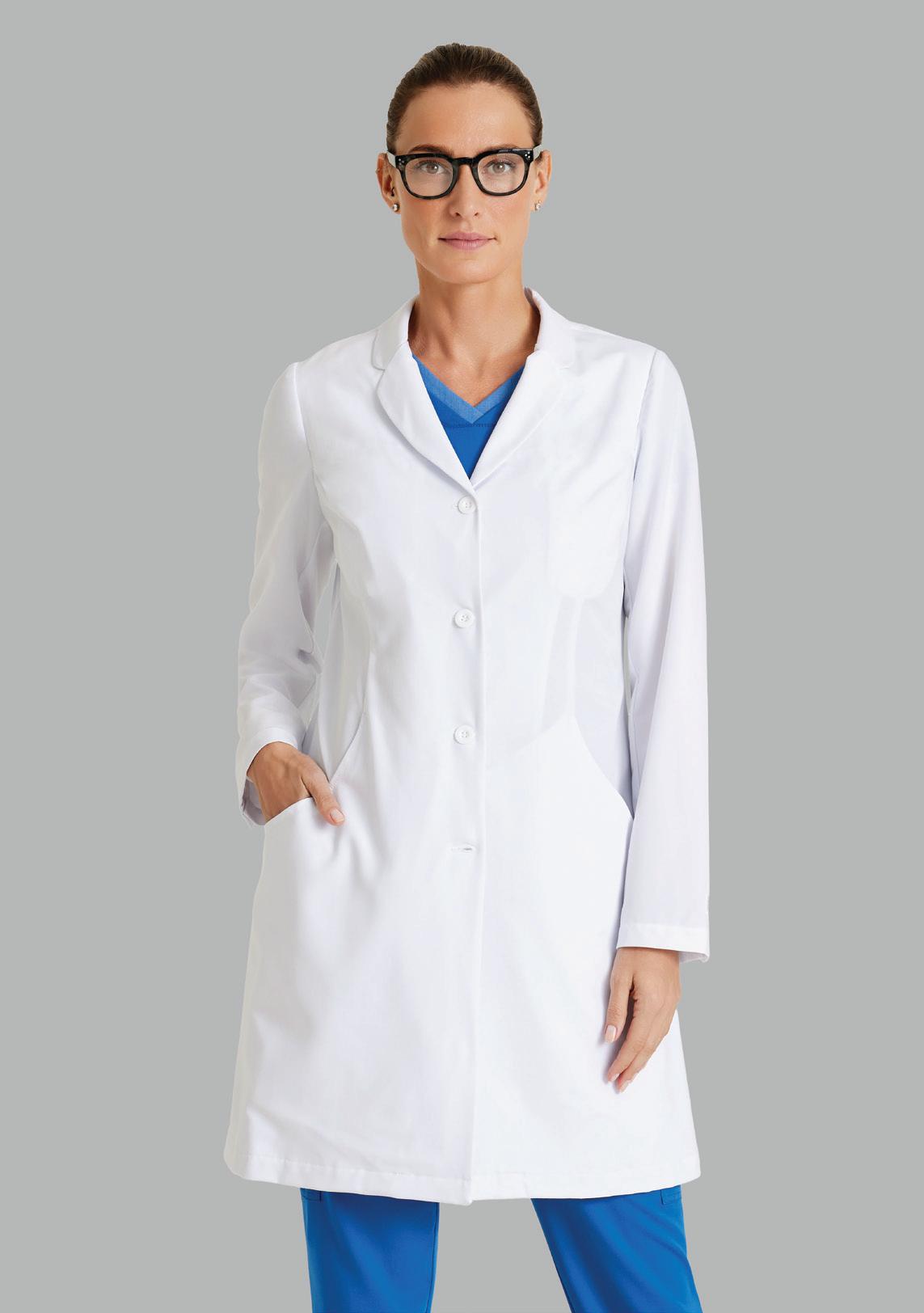 Women's 3-pocket 3-button, notch lapel, front princess seams, tablet waist pockets, back belt with center back vent, long sleeve lab coat