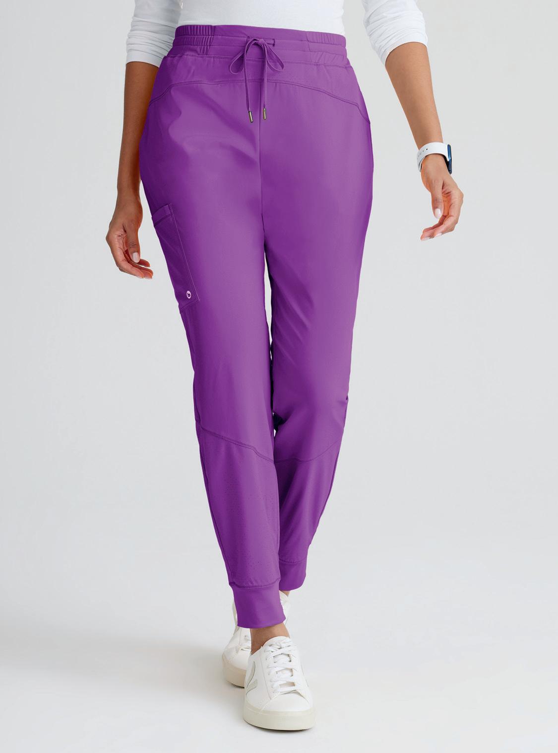 5-pocket encased elastic waistband with drawcord, on-seam zipper front pockets with shadow top stitching, patch cargo pocket with pen slot, ribbed cuff jogger