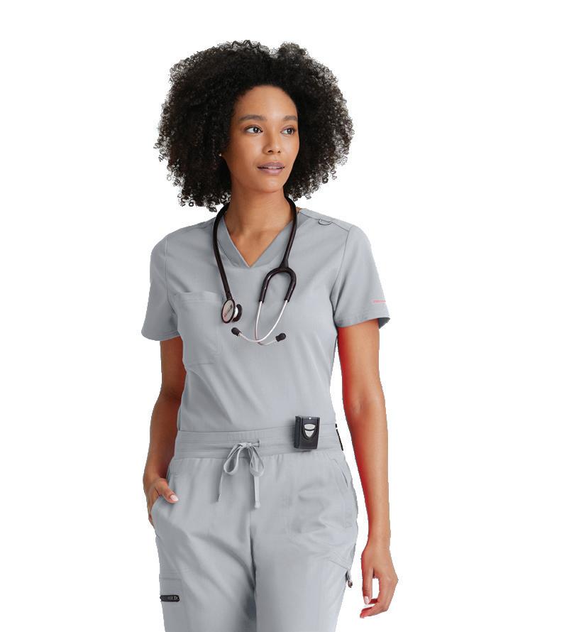 1-pocket banded curved v-neck, chest patch pocket, front and back princess seams, shoulder Steel badge loop, tulip hem top