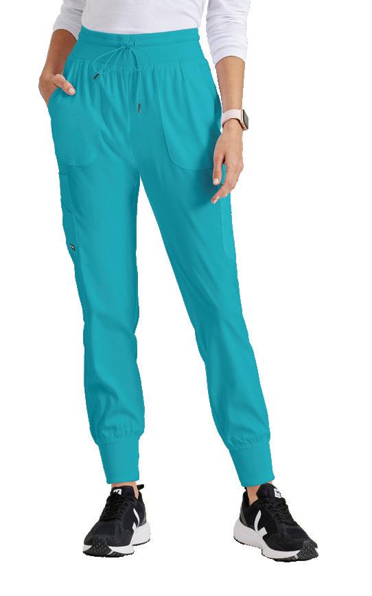 5-pocket, high-rise slim pant, flat front waistband with interior drawcord, dyedto-match zip front pockets, double cargo PDA pocket, back pocket pant