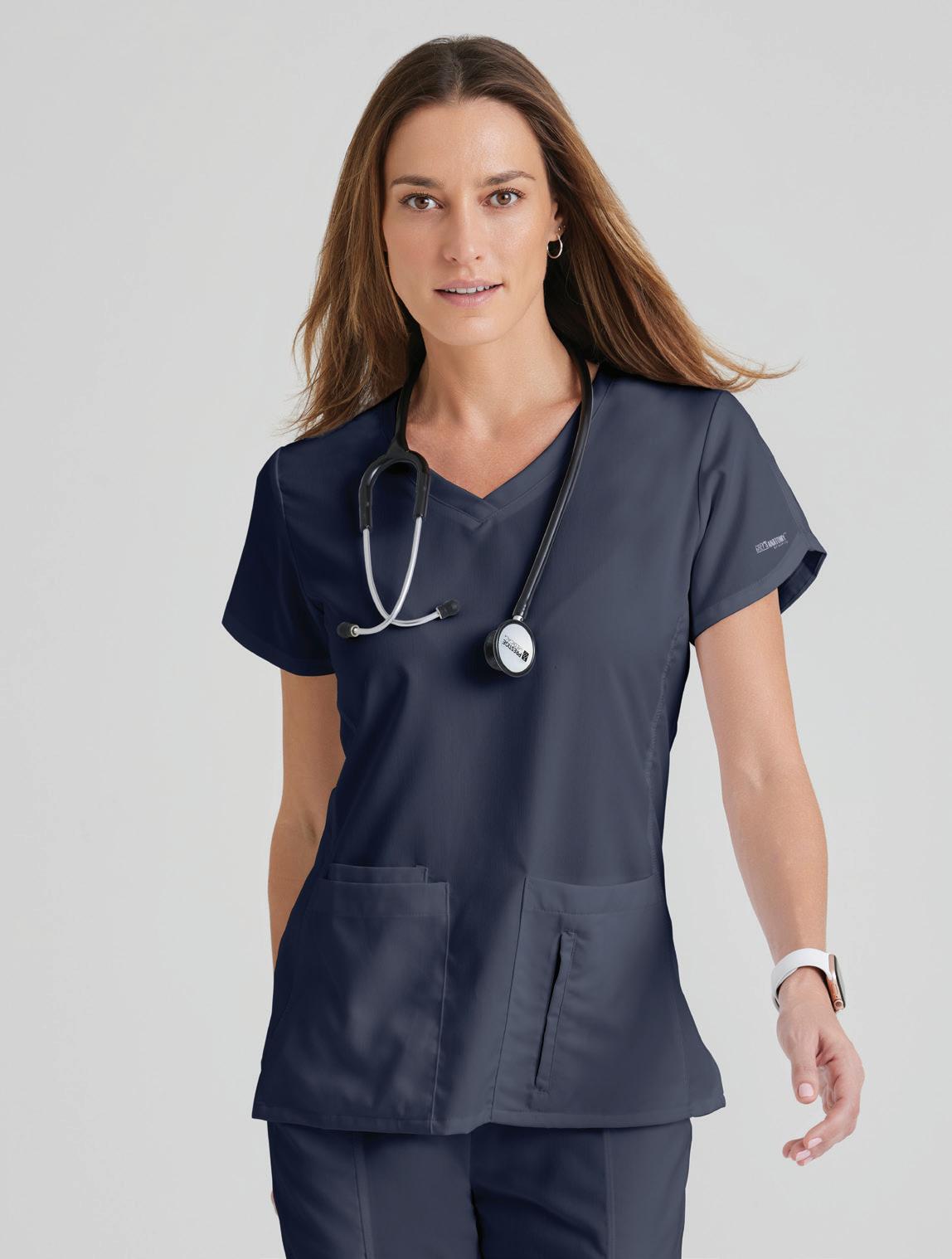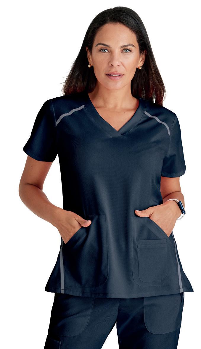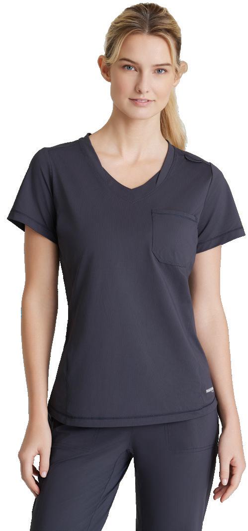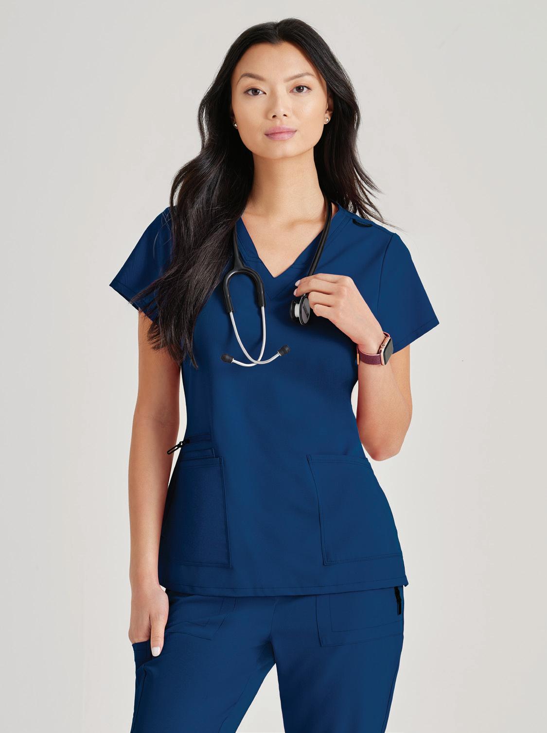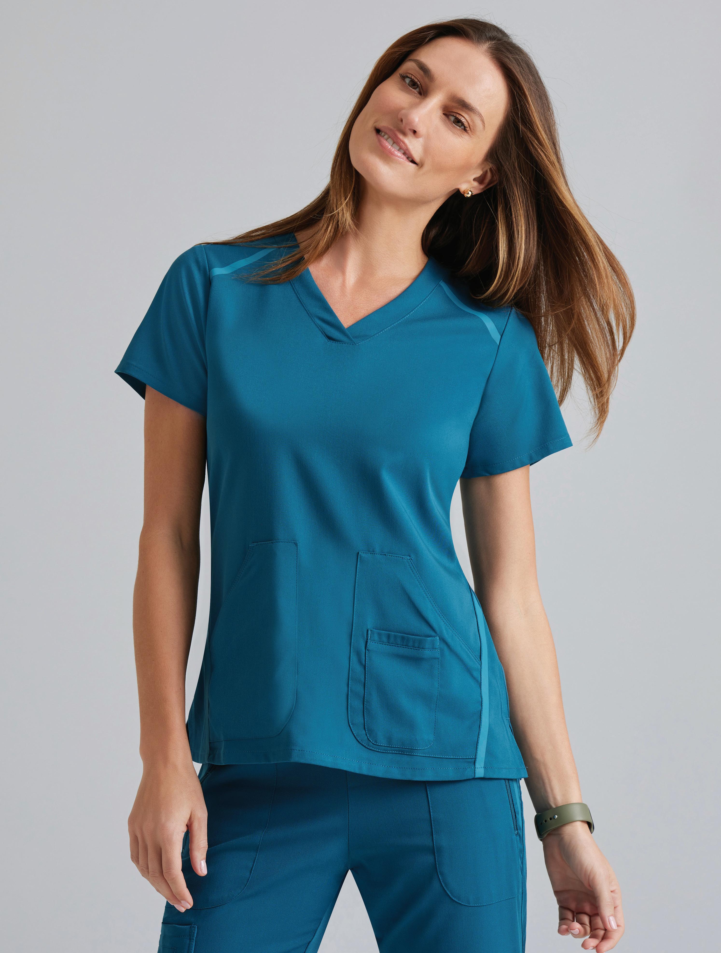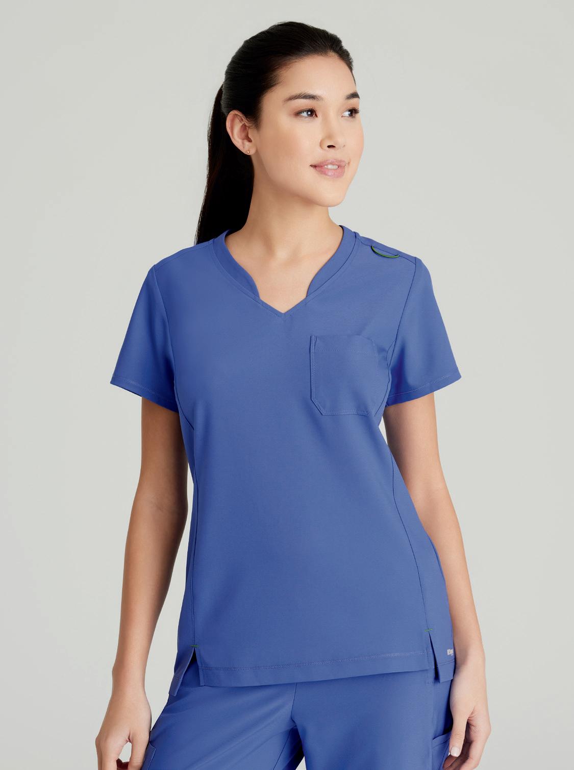 1-pocket banded curved v-neck, chest patch pocket, front and back princess seams, shoulder Steel badge loop, tulip hem top
