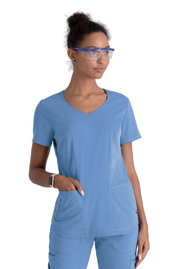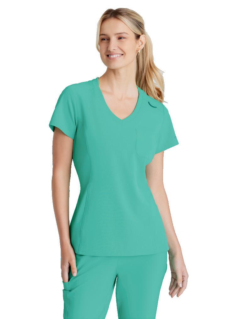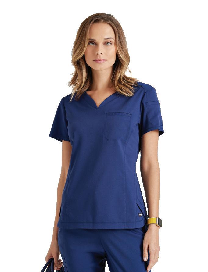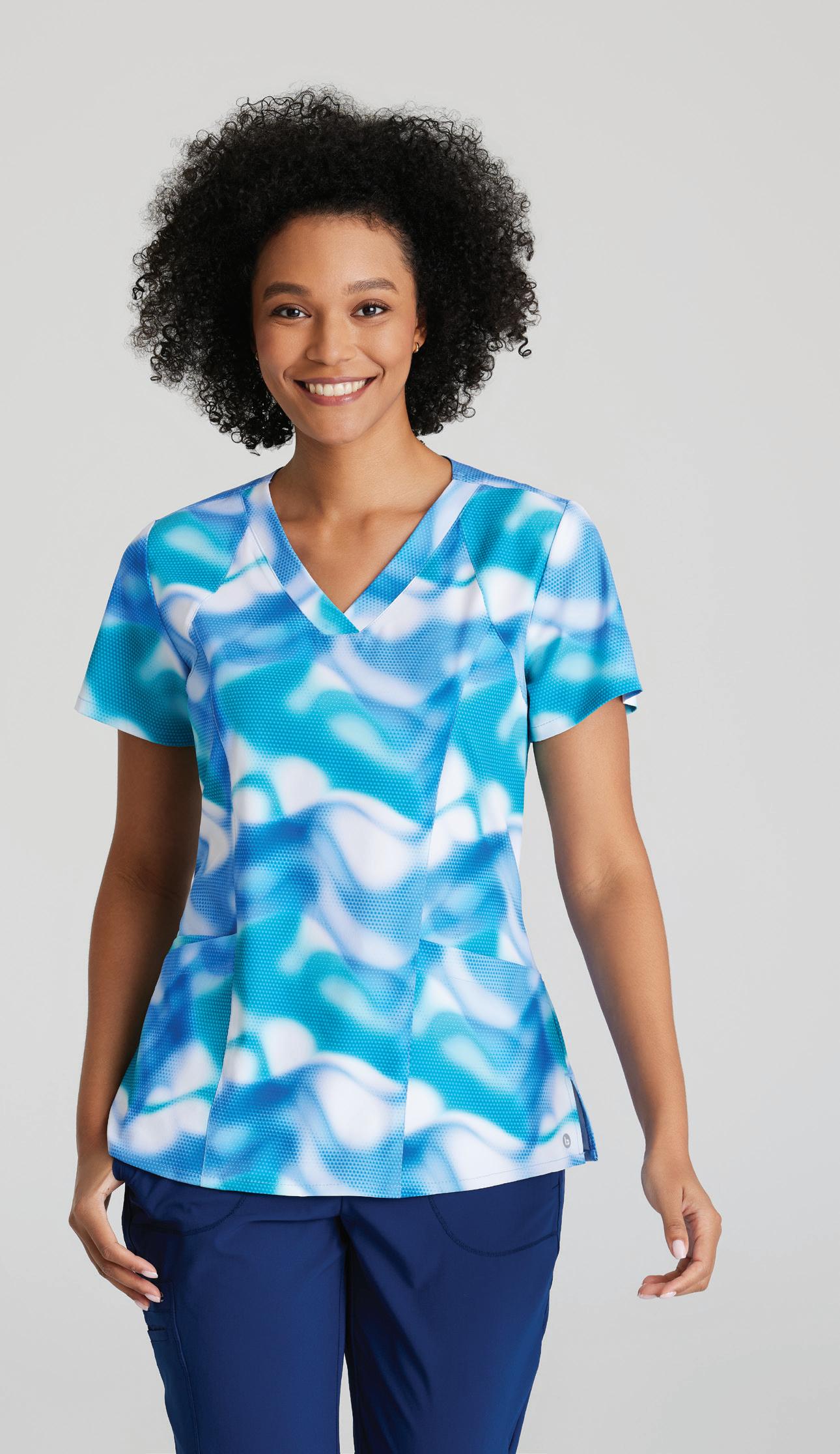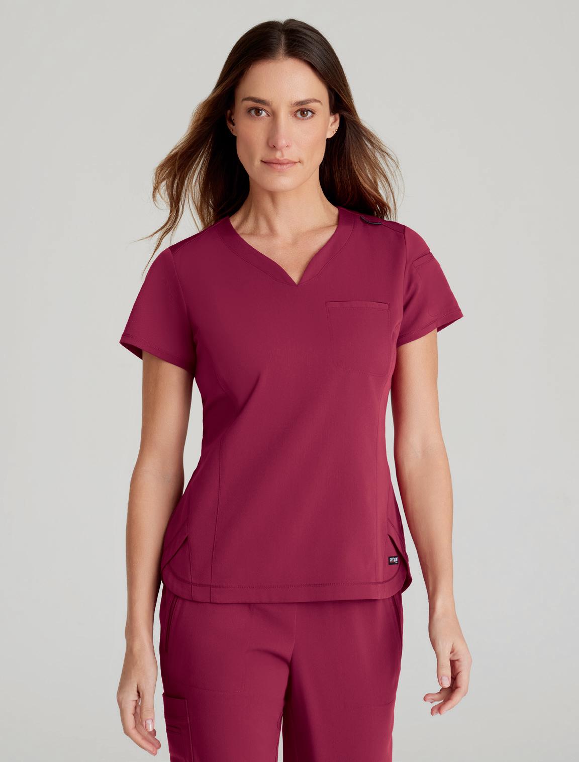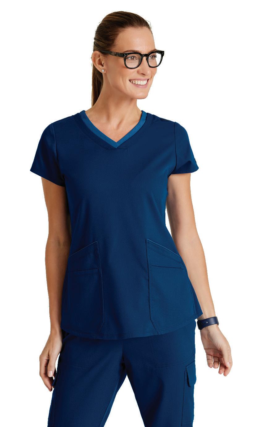 1-pocket banded curved v-neck, chest patch pocket, front and back princess seams, shoulder Steel badge loop, tulip hem top