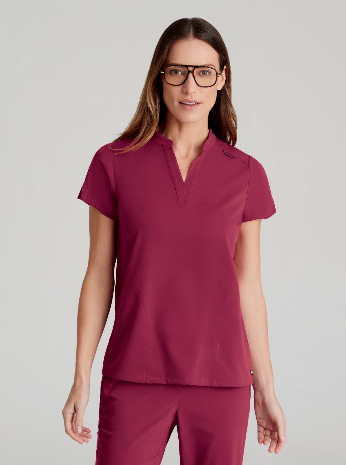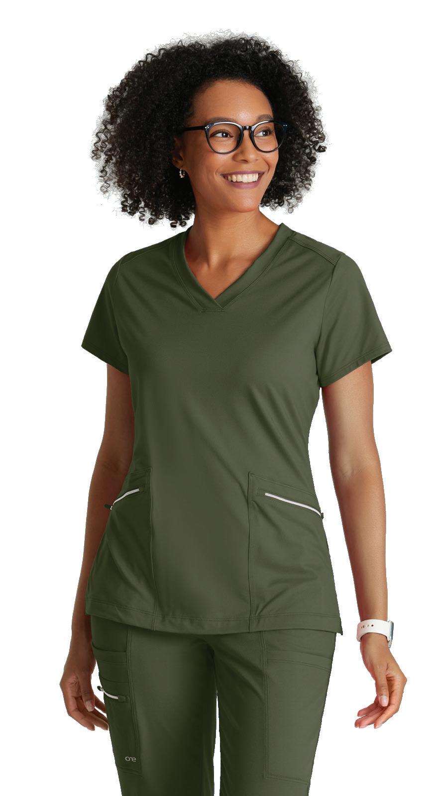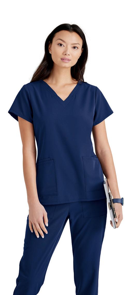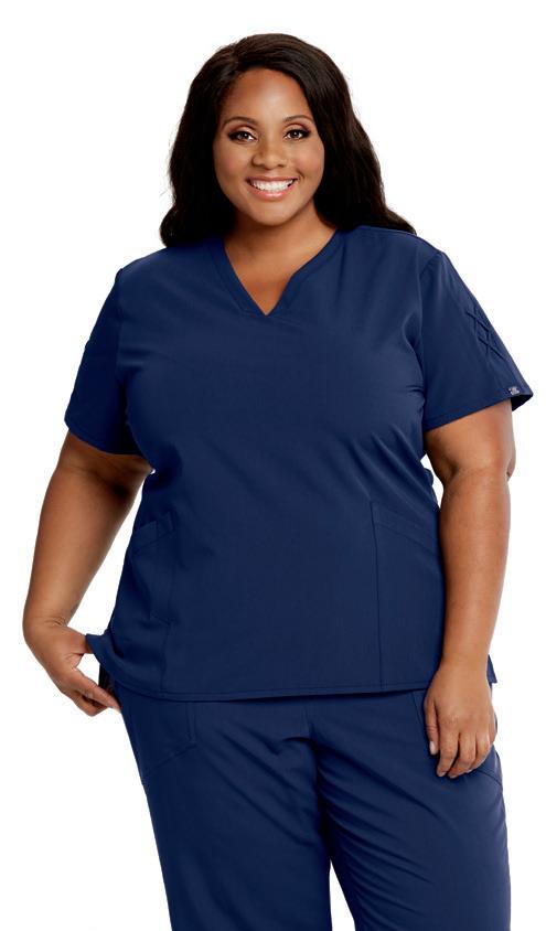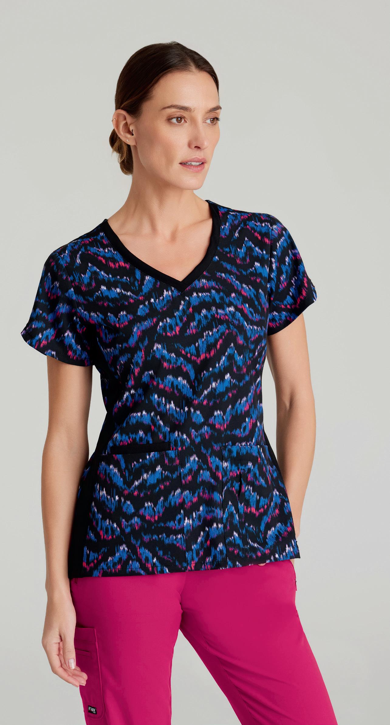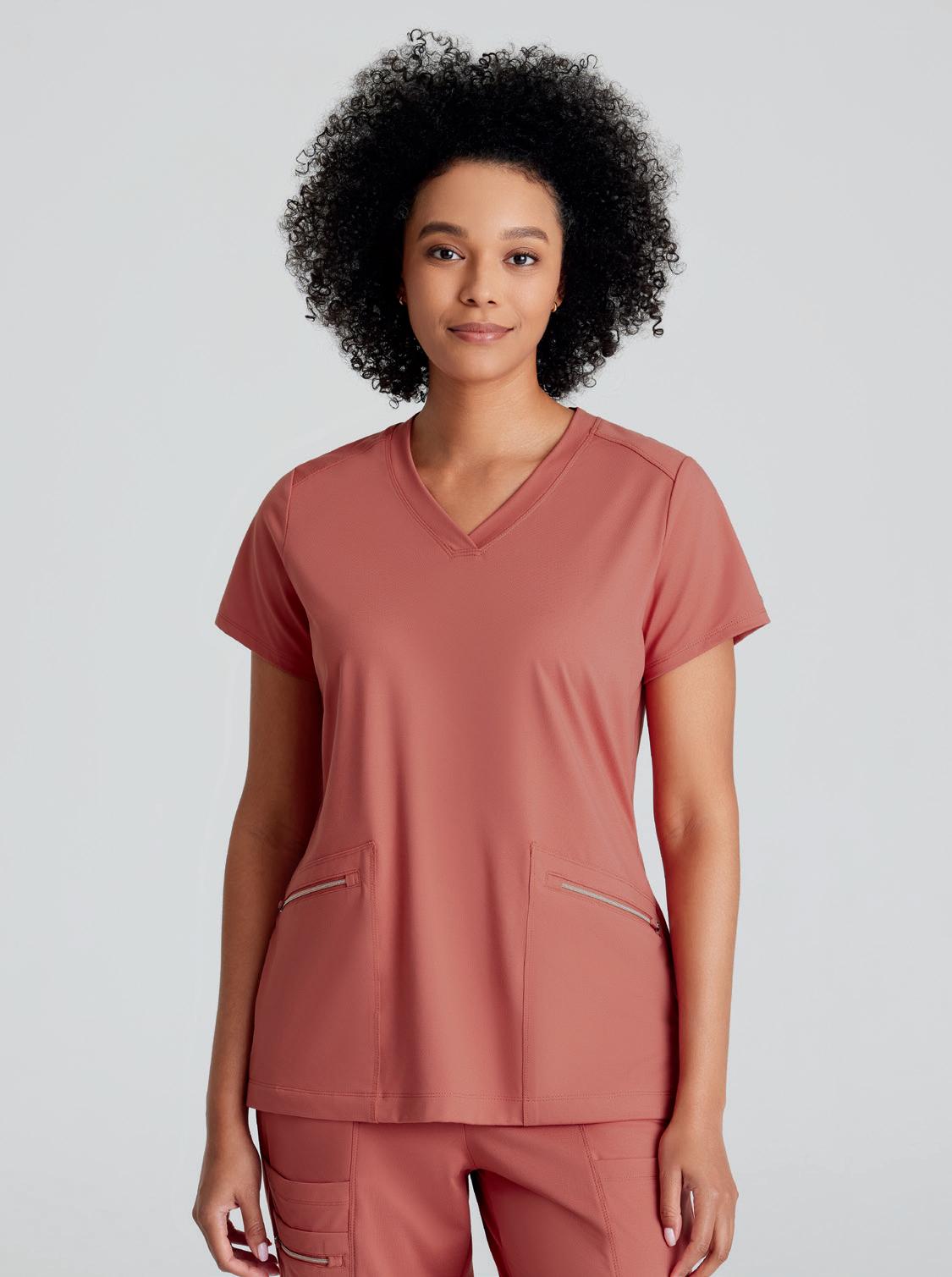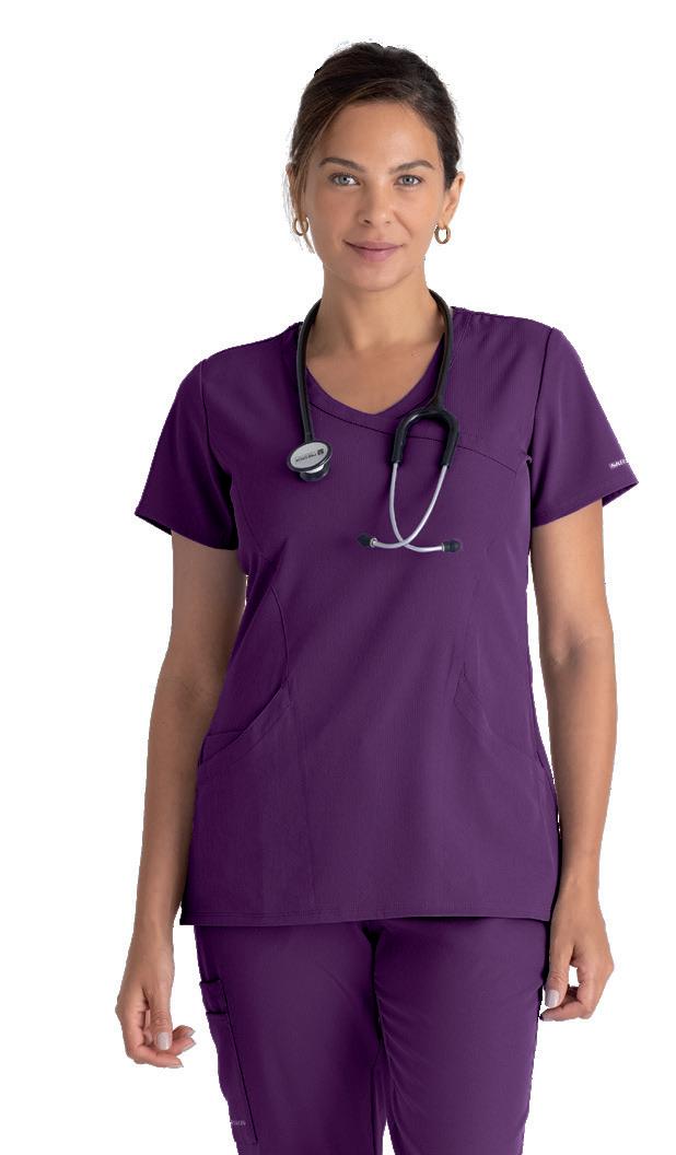 1-pocket banded curved v-neck, chest patch pocket, front and back princess seams, shoulder Steel badge loop, tulip hem top