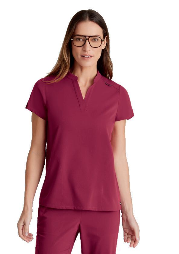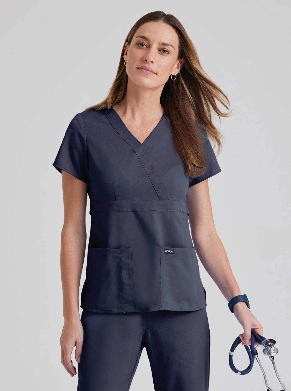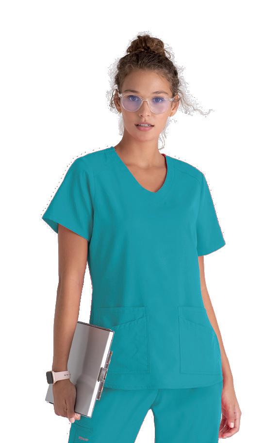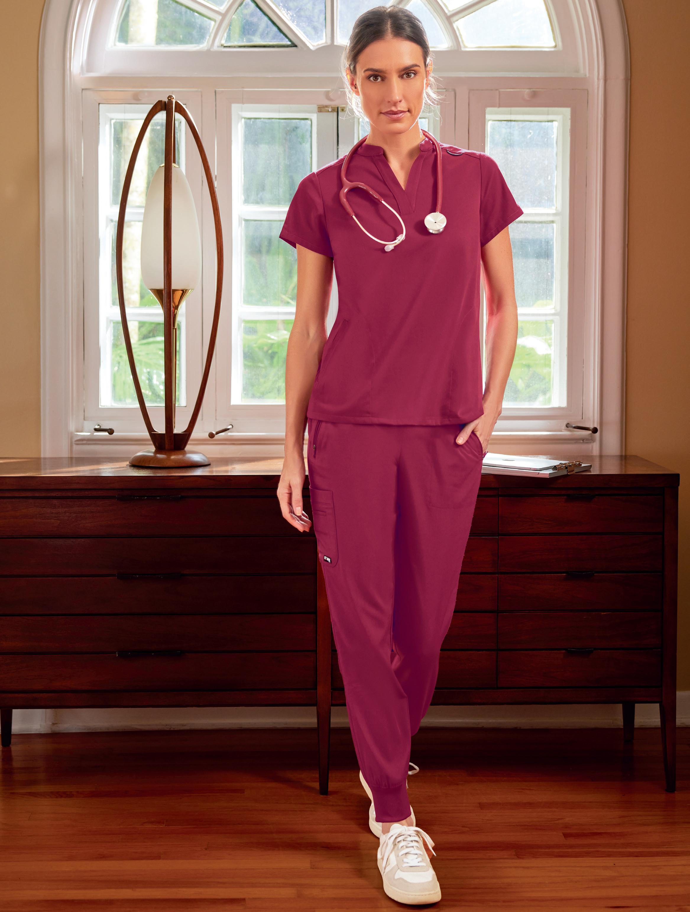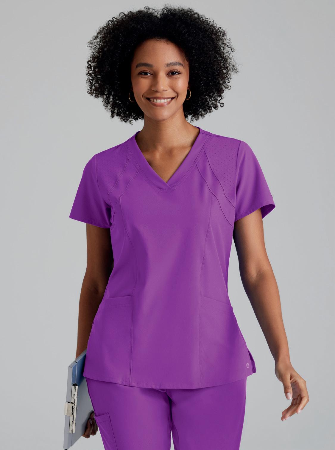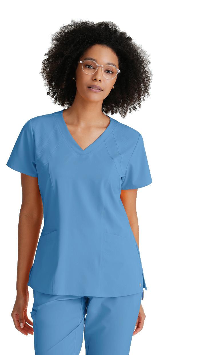 1-pocket banded curved v-neck, chest patch pocket, front and back princess seams, shoulder Steel badge loop, tulip hem top