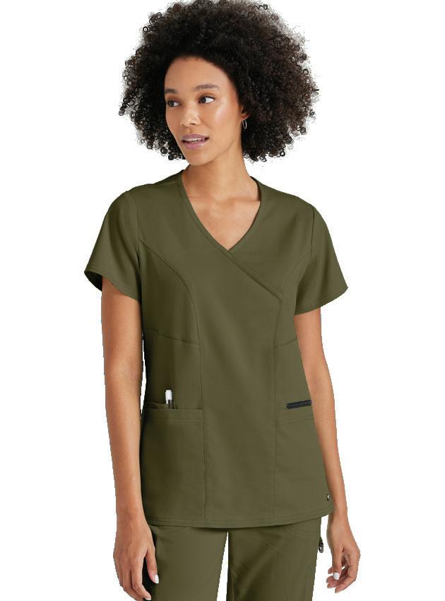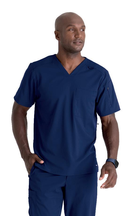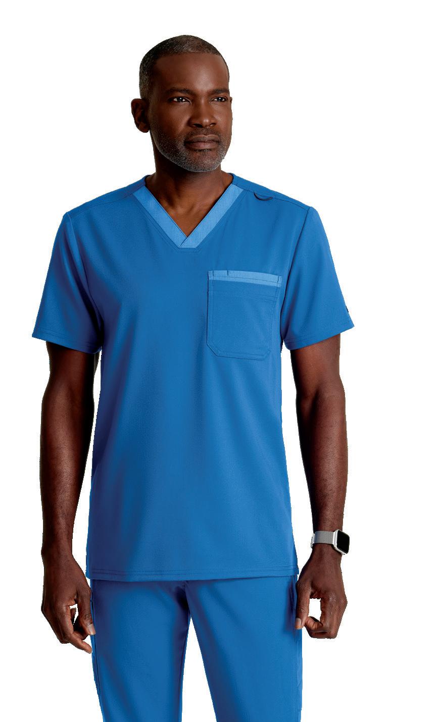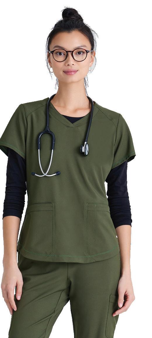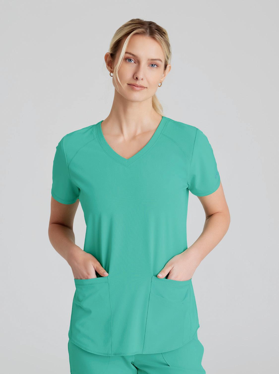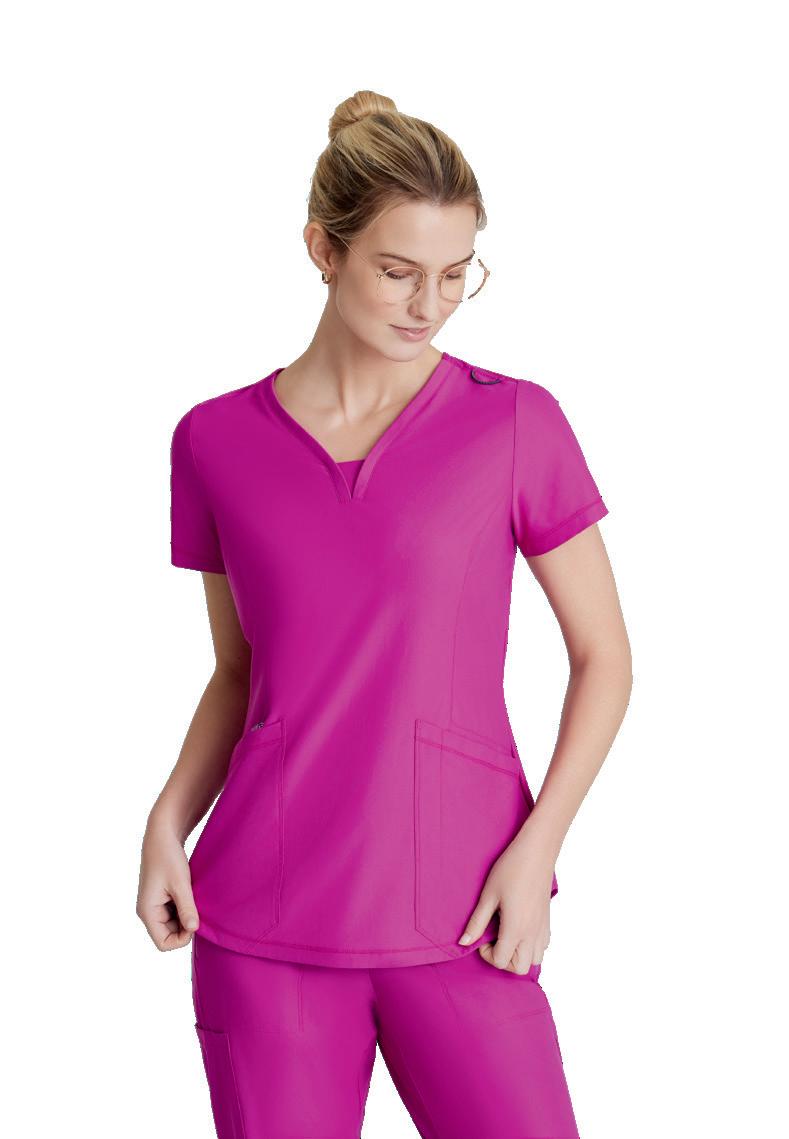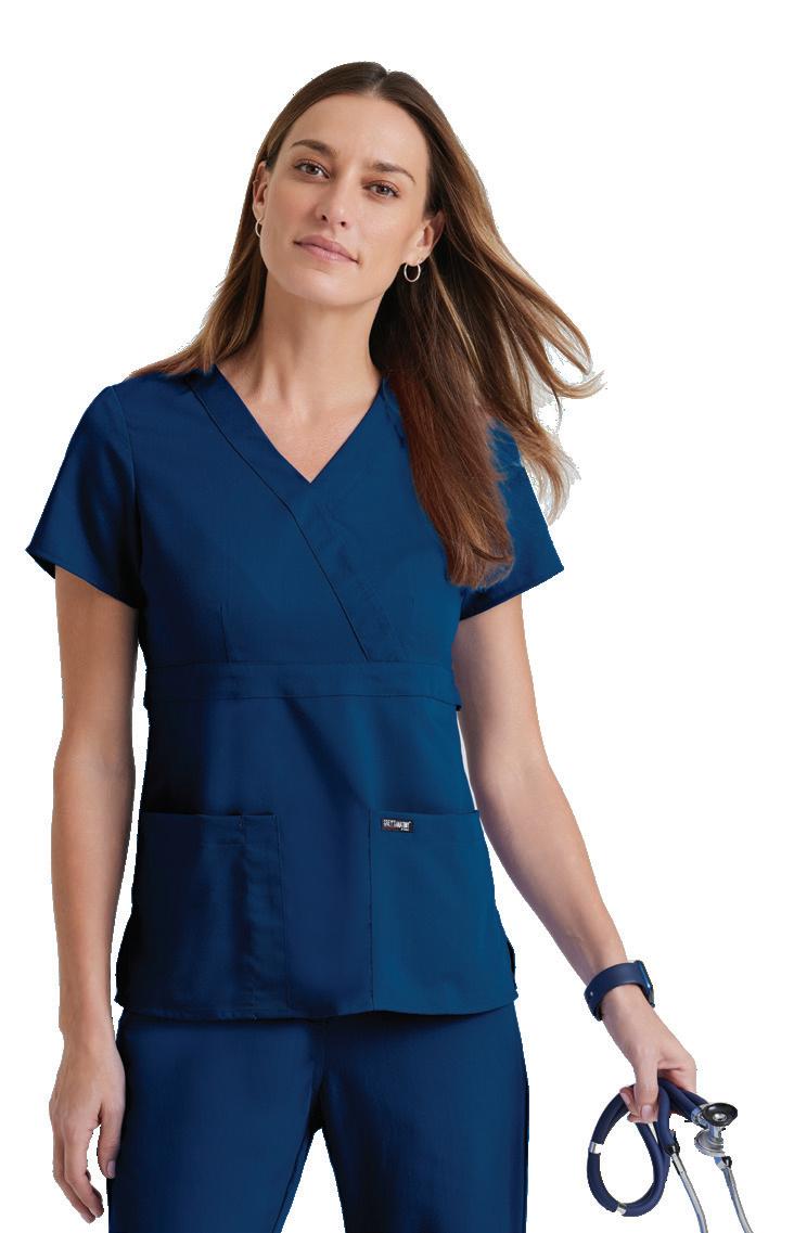 1-pocket banded curved v-neck, chest patch pocket, front and back princess seams, shoulder Steel badge loop, tulip hem top