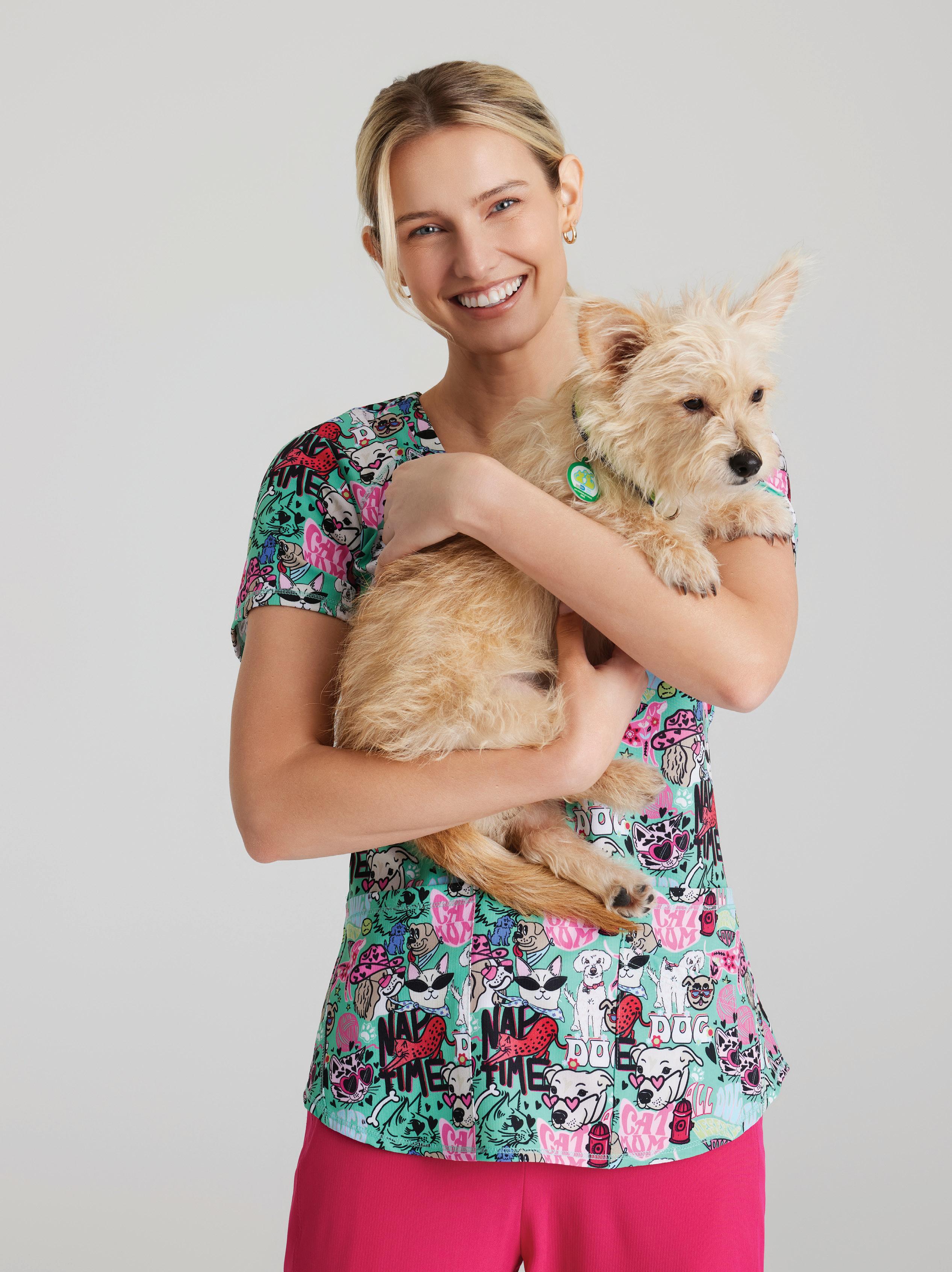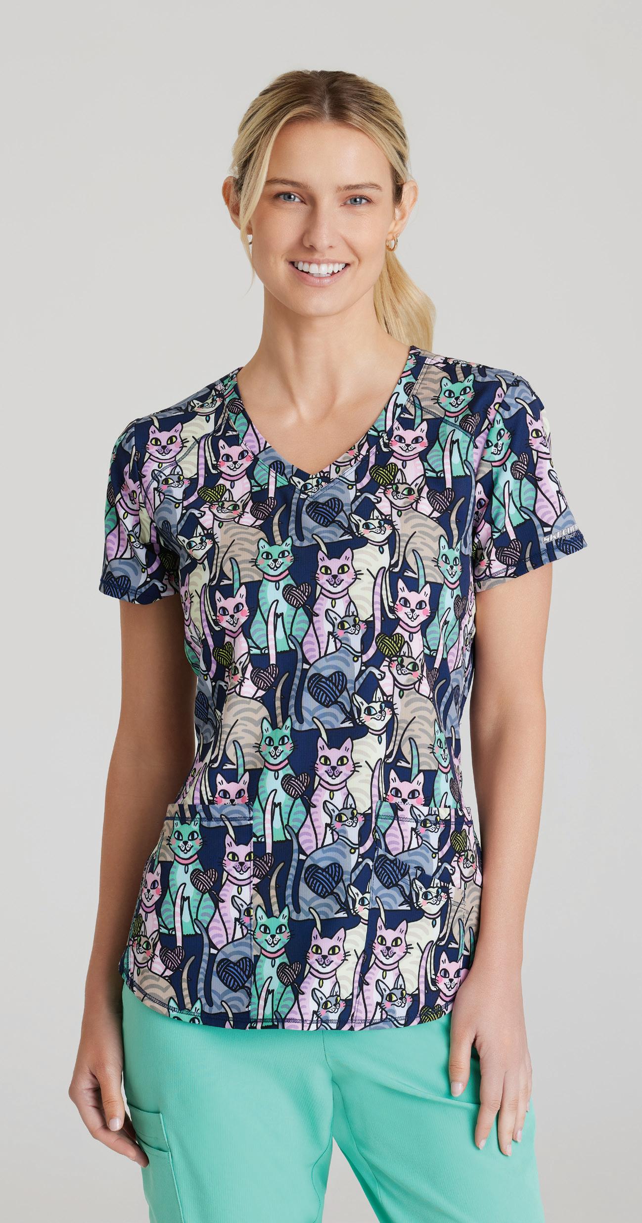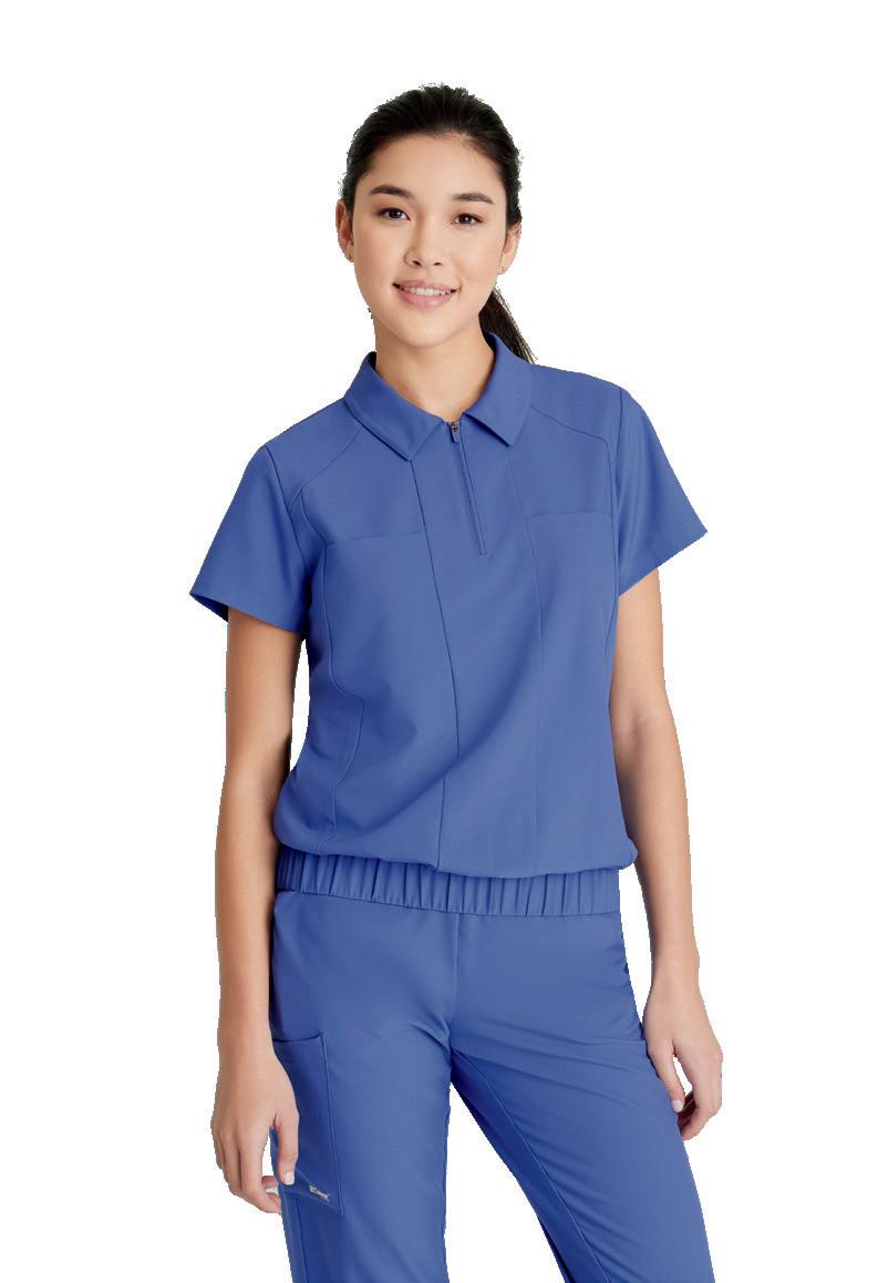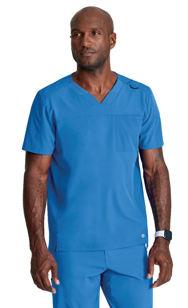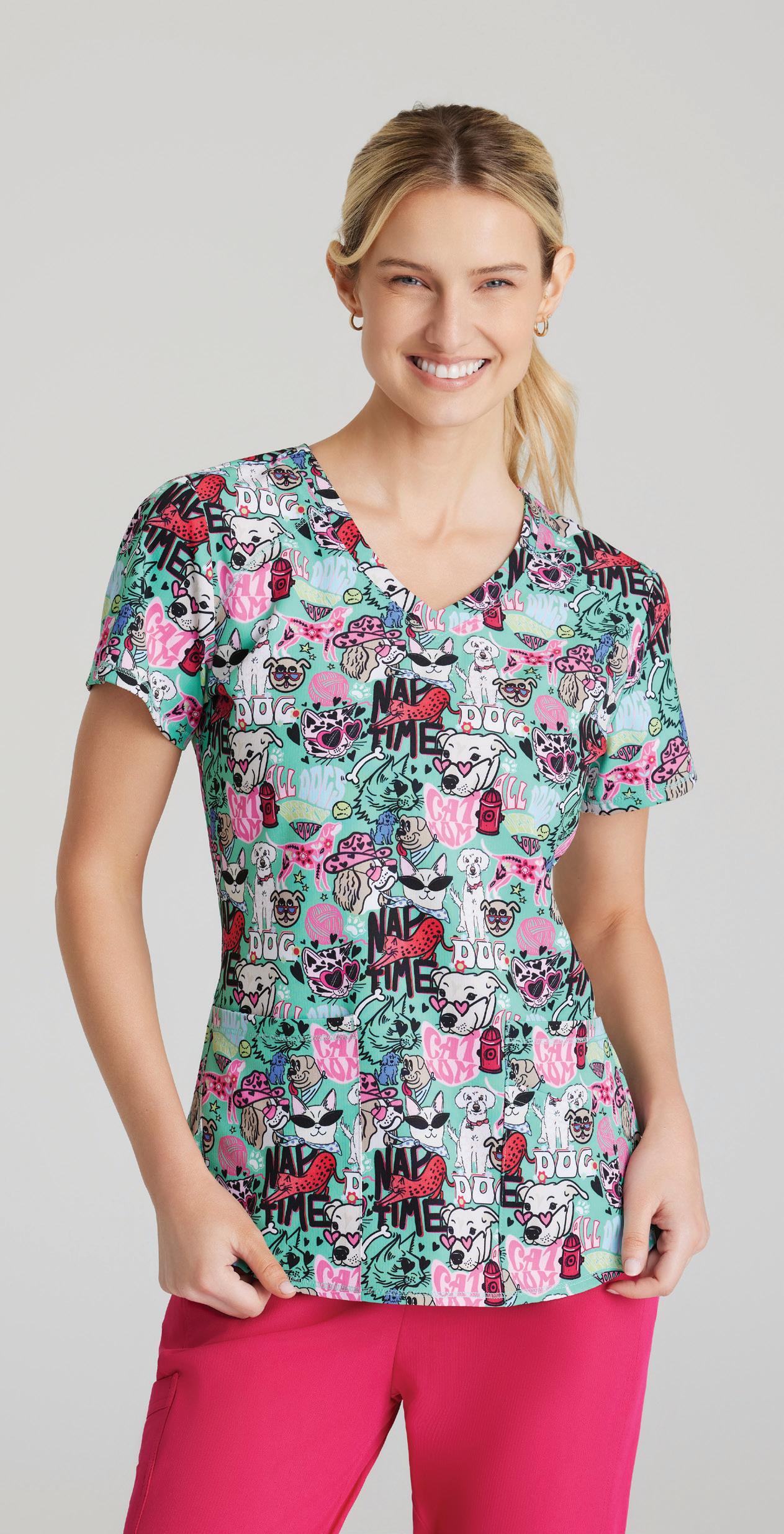 1-pocket banded curved v-neck, chest patch pocket, front and back princess seams, shoulder Steel badge loop, tulip hem top