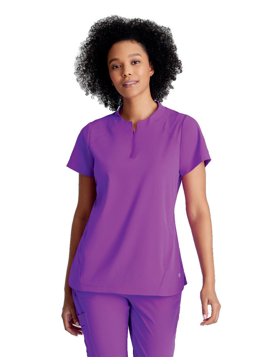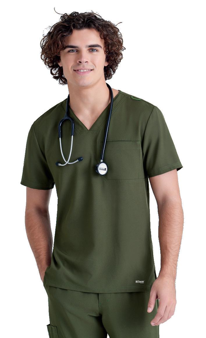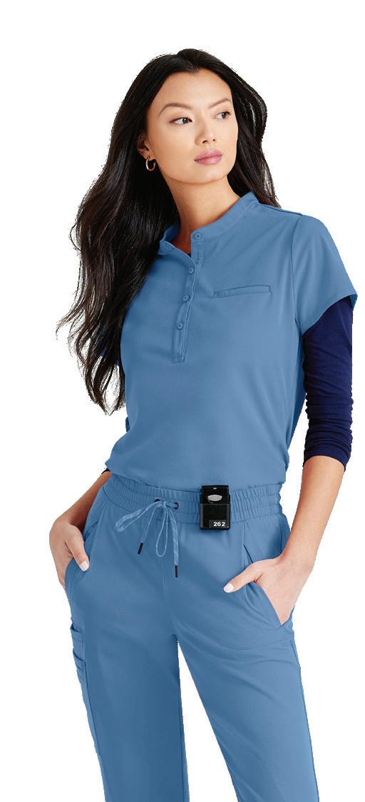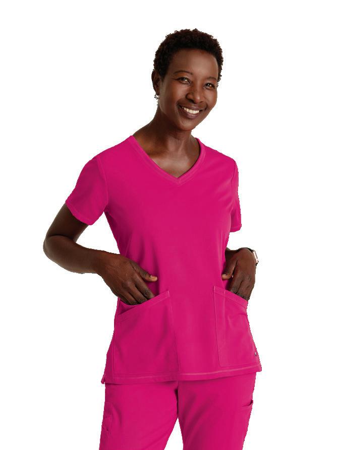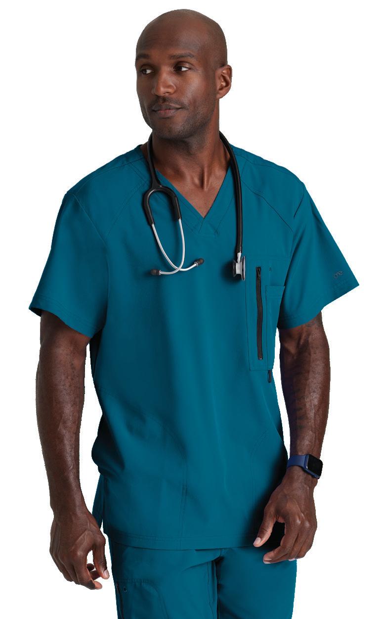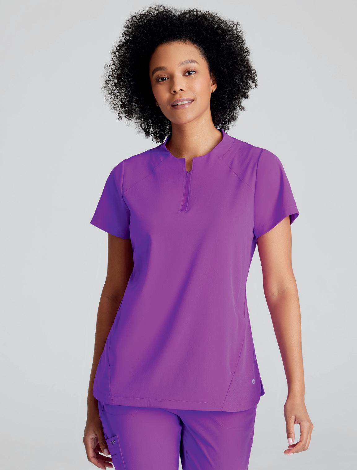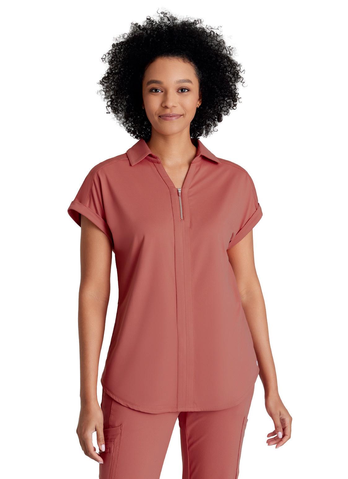 1-pocket banded curved v-neck, chest patch pocket, front and back princess seams, shoulder Steel badge loop, tulip hem top