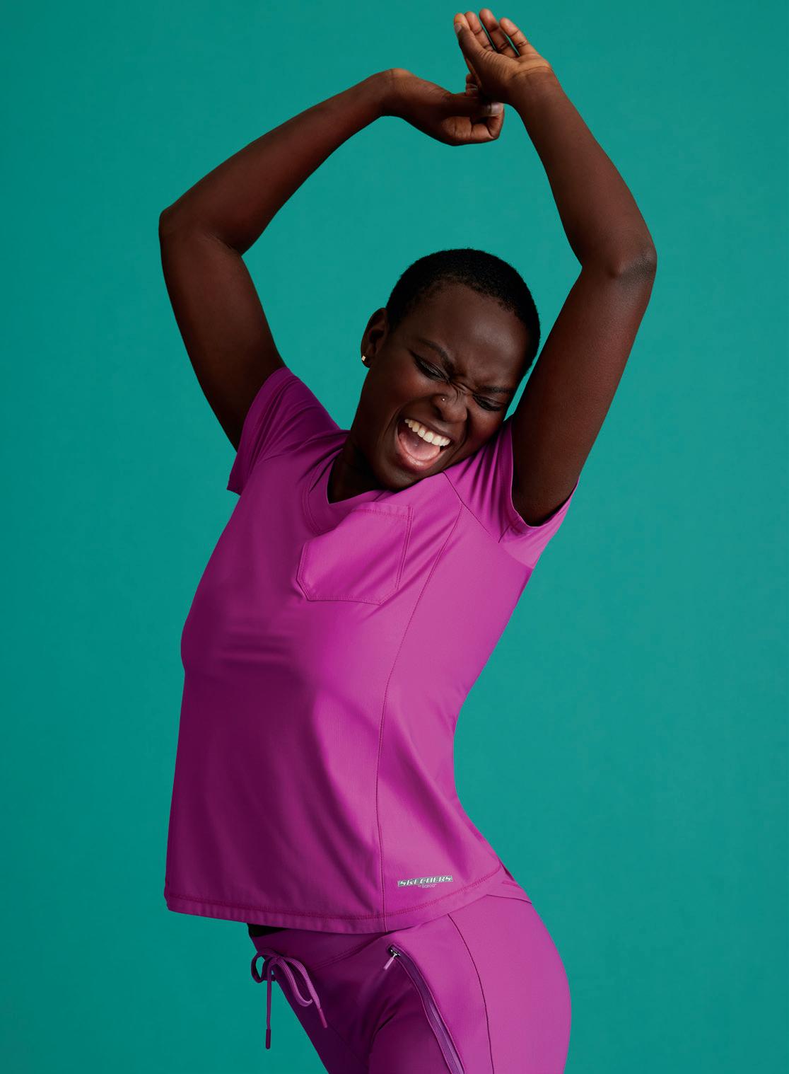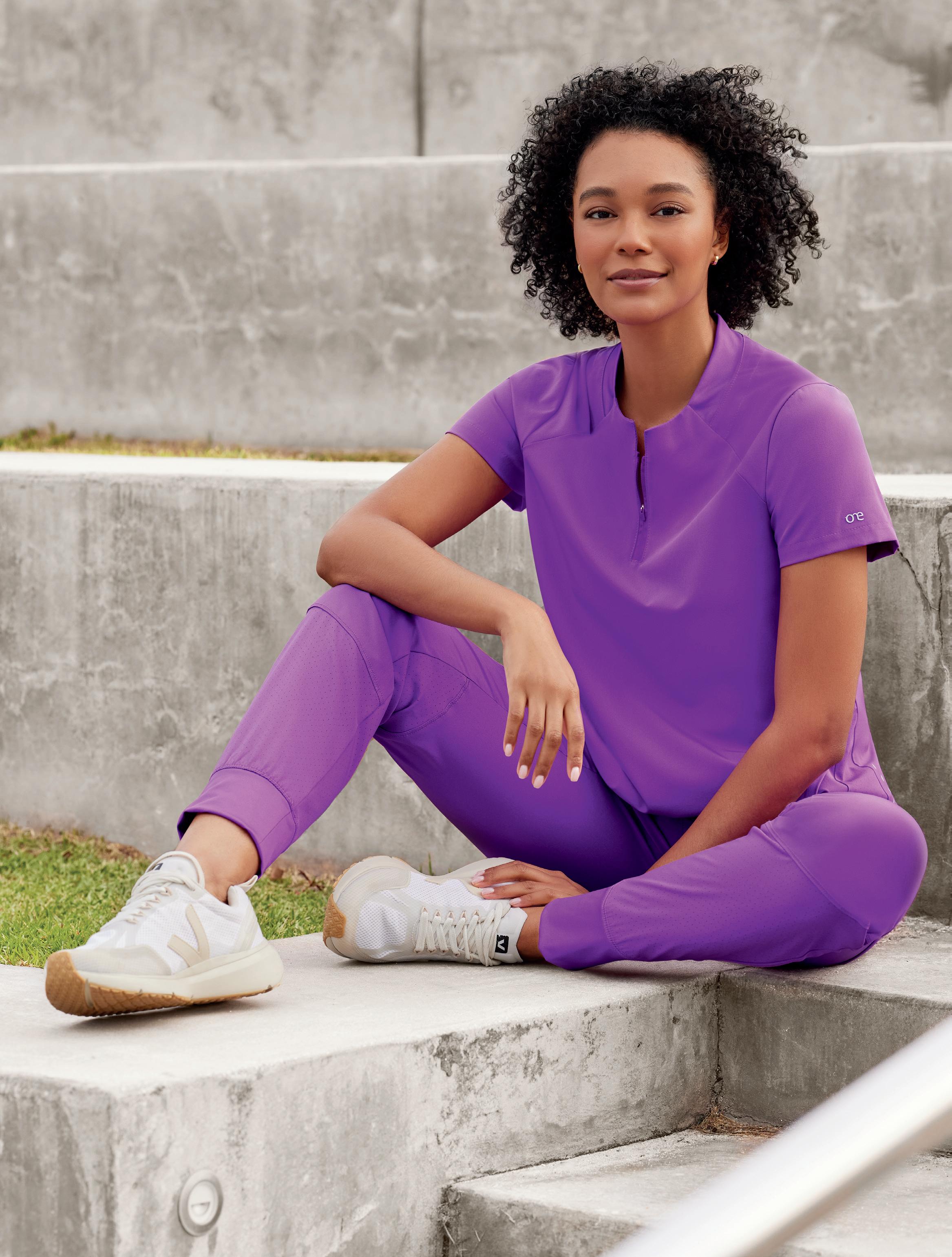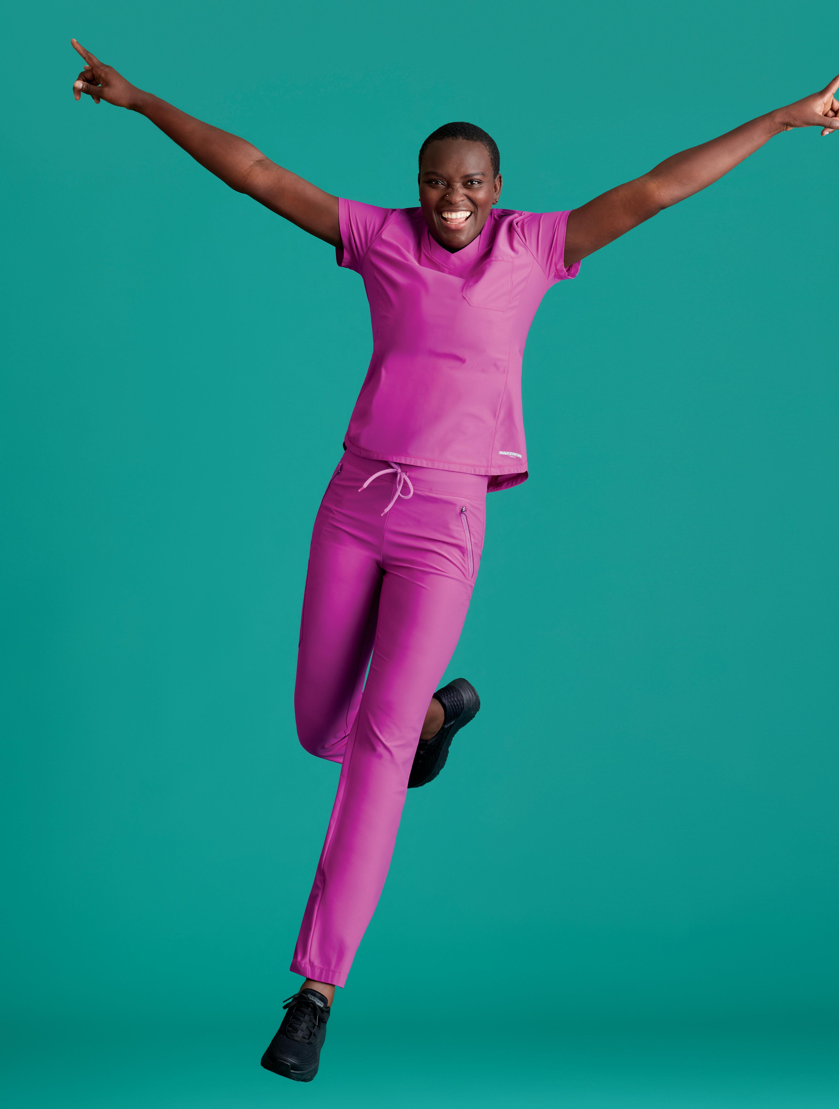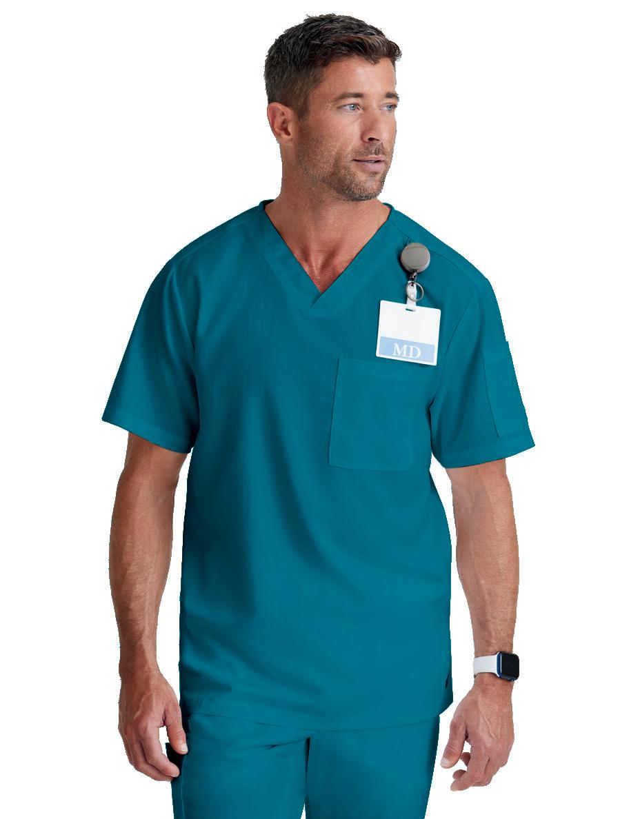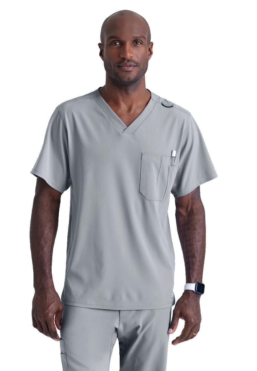 1-pocket banded curved v-neck, chest patch pocket, front and back princess seams, shoulder Steel badge loop, tulip hem top