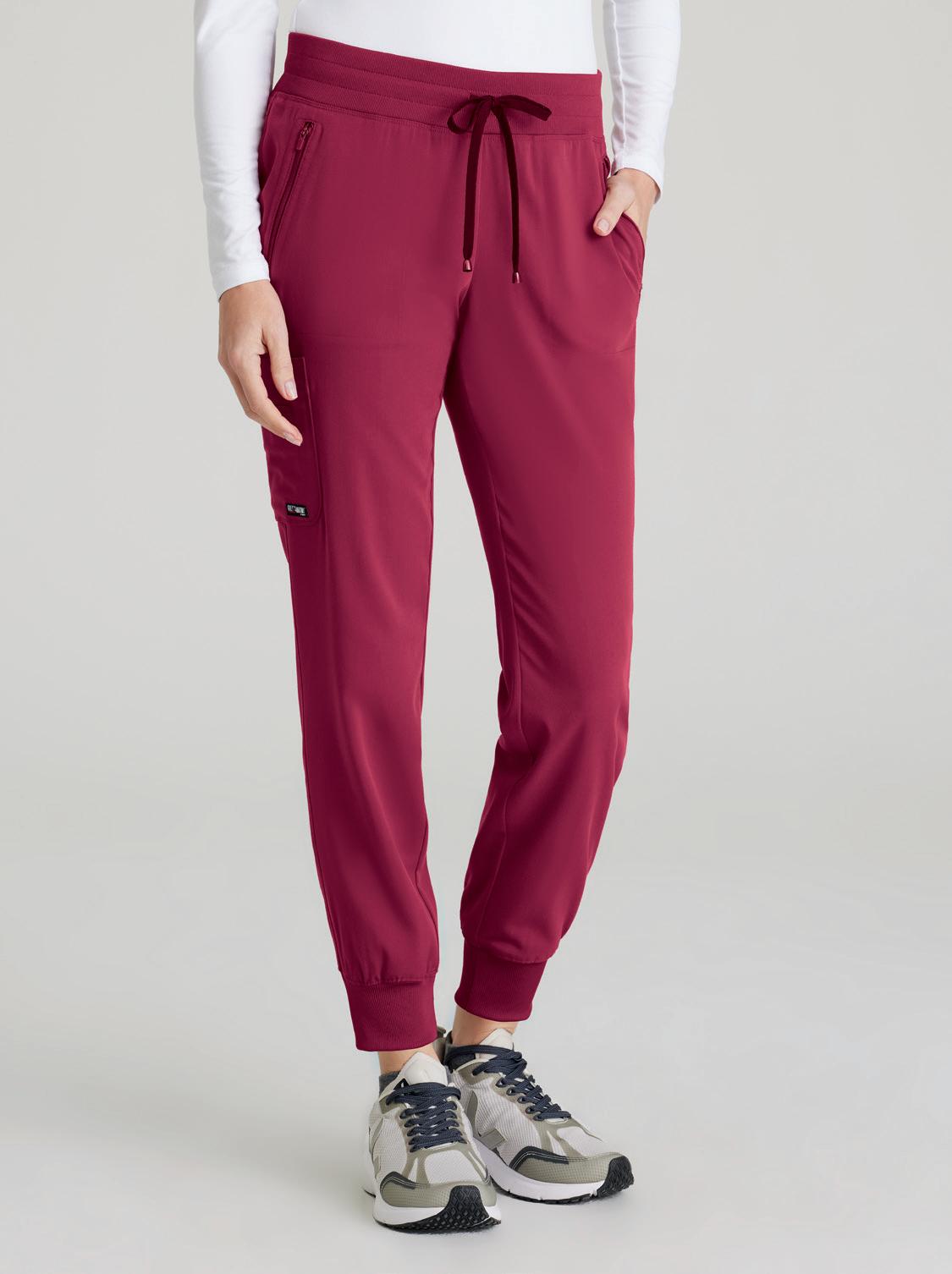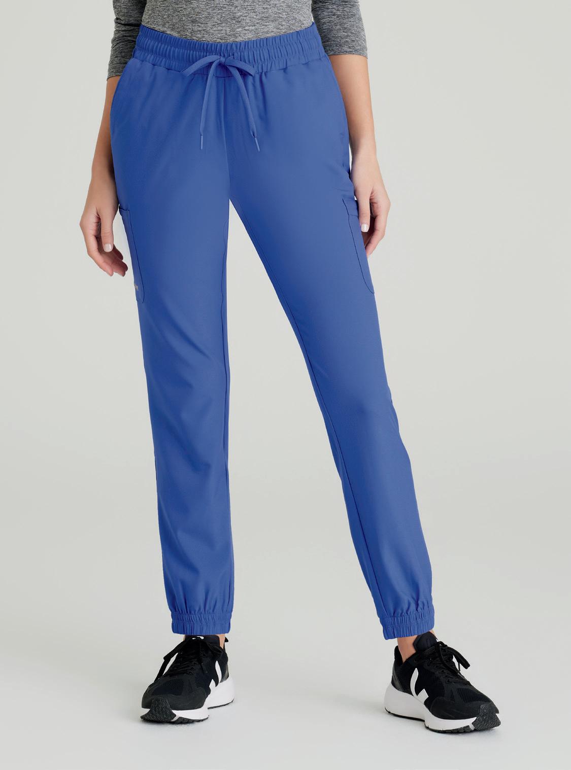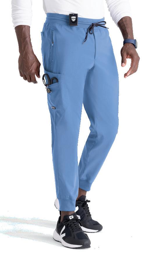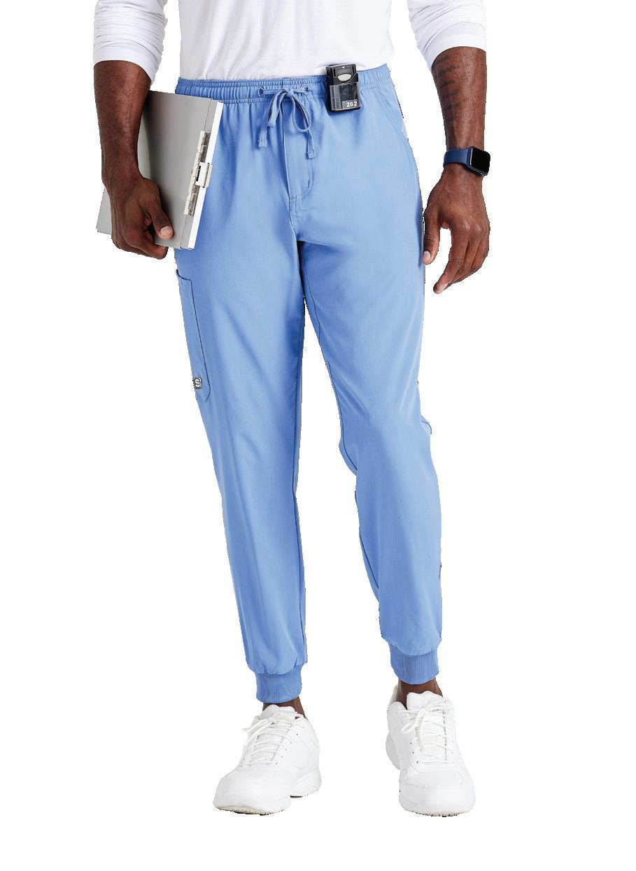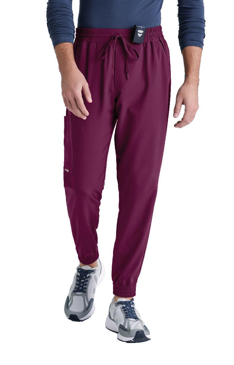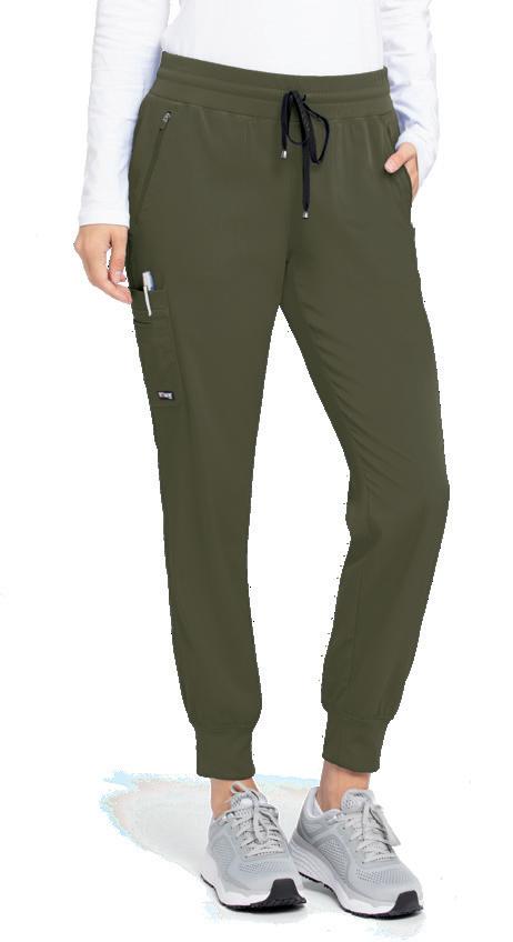 5-pocket encased elastic waistband with drawcord, on-seam zipper front pockets with shadow top stitching, patch cargo pocket with pen slot, ribbed cuff jogger