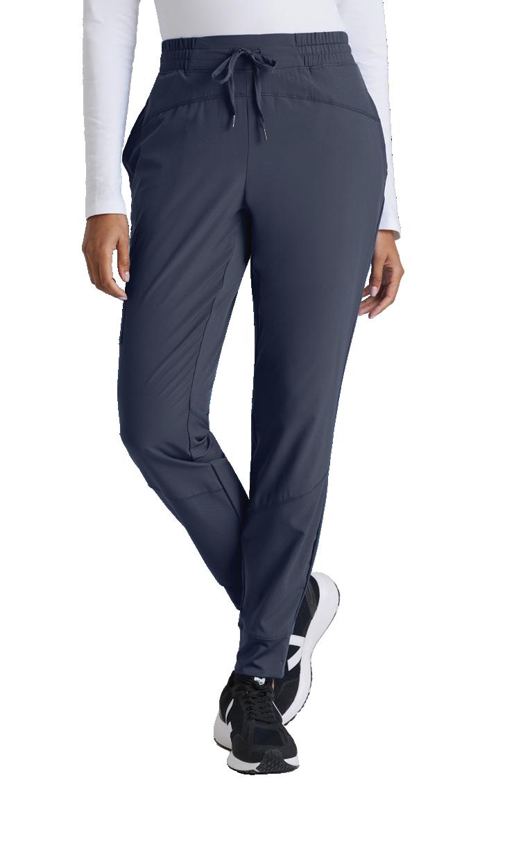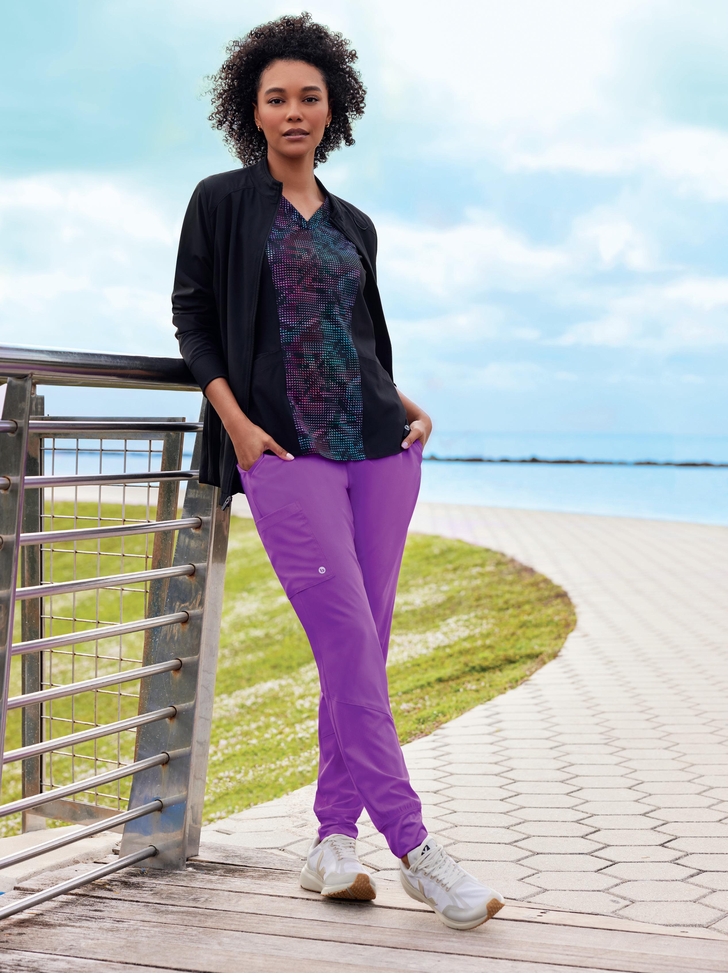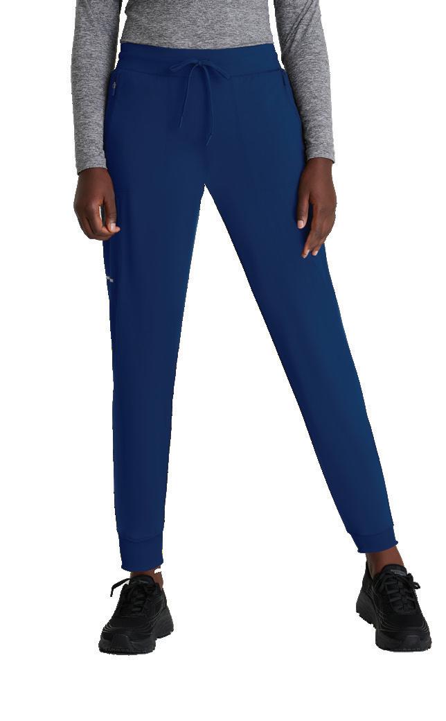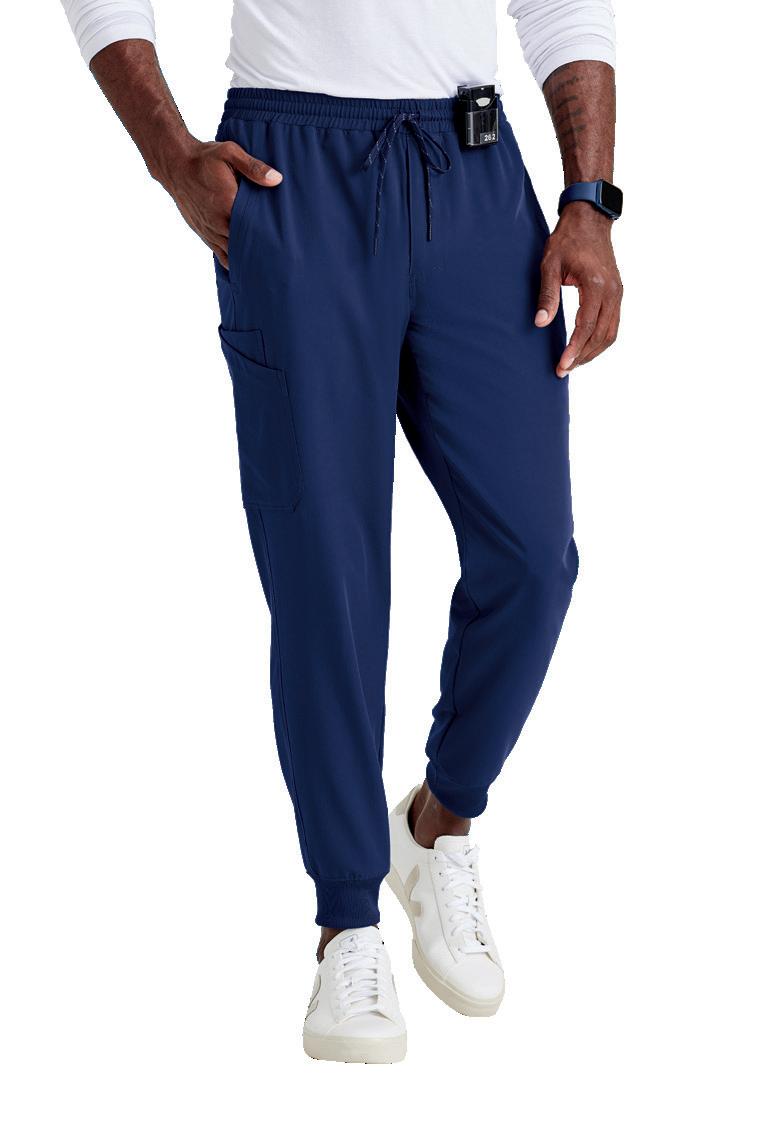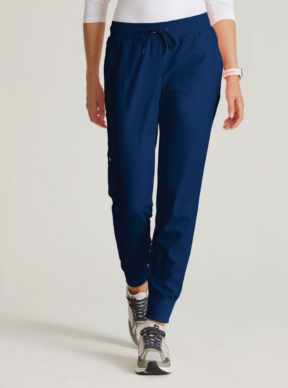 5-pocket encased elastic waistband with drawcord, on-seam zipper front pockets with shadow top stitching, patch cargo pocket with pen slot, ribbed cuff jogger