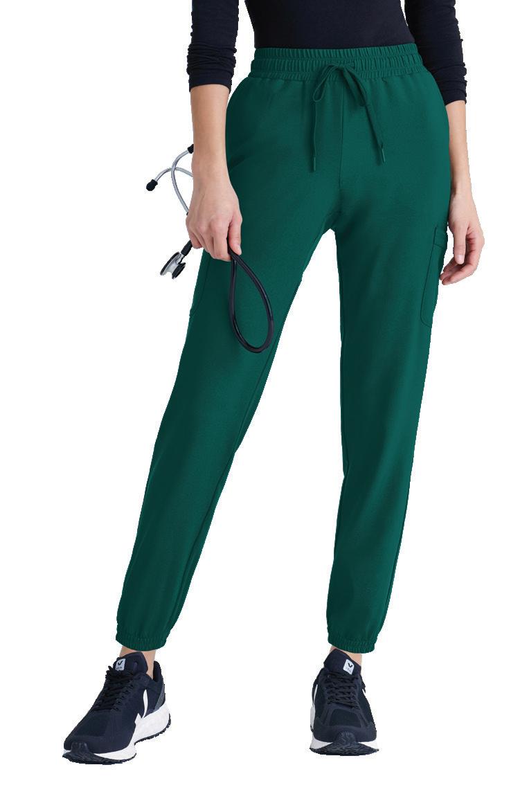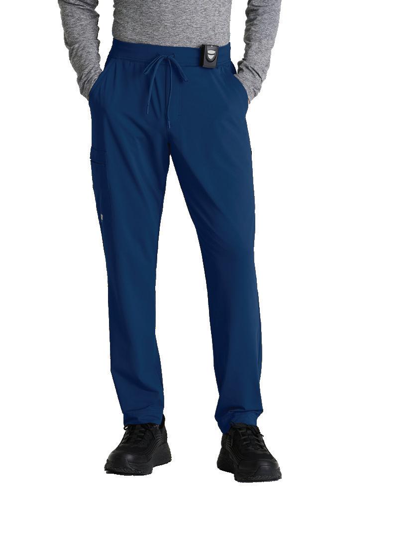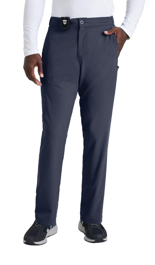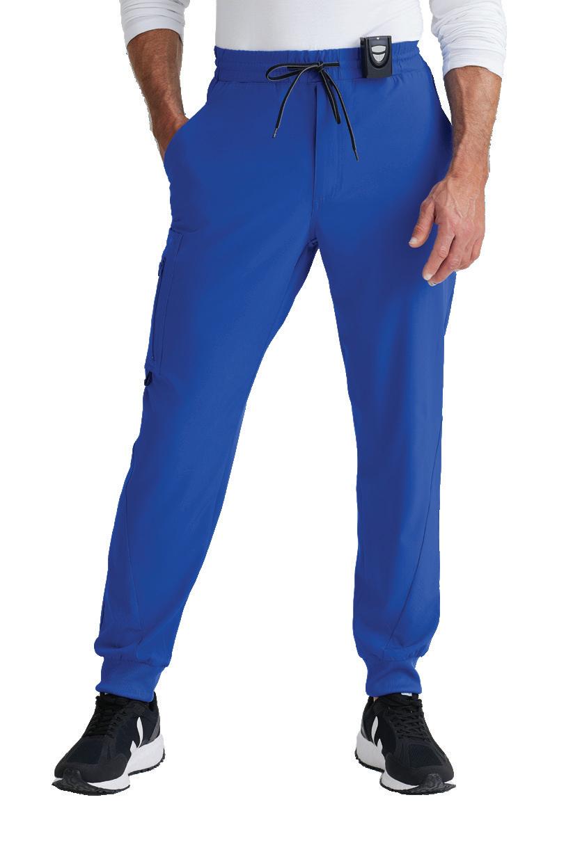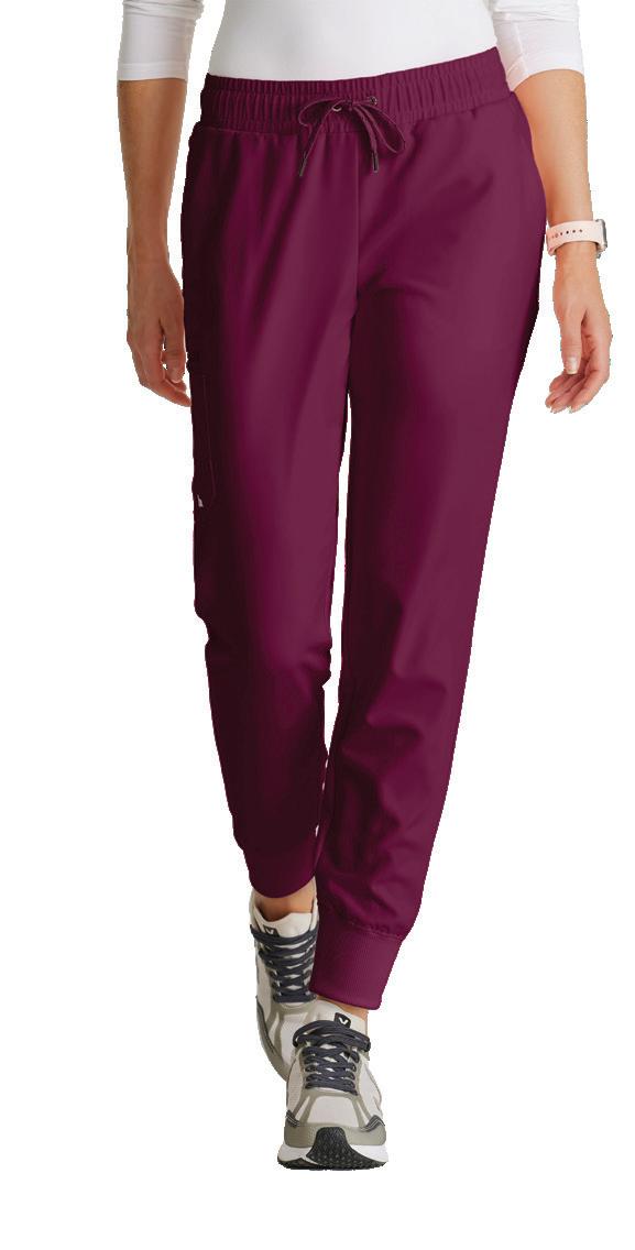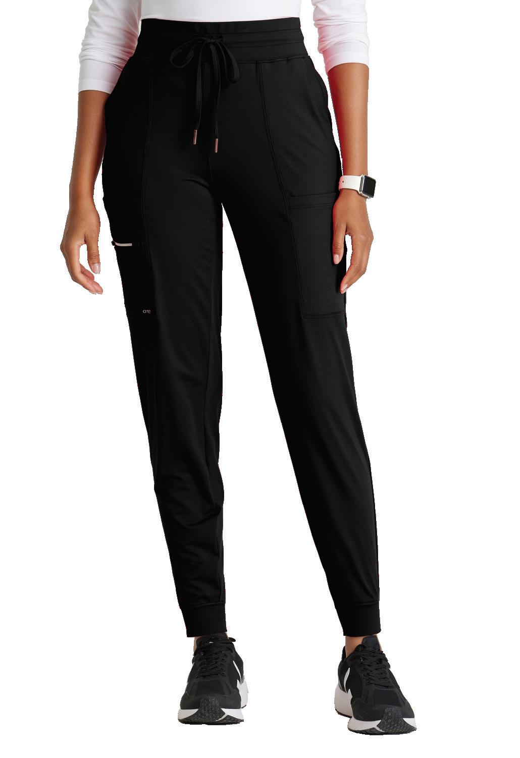 5-pocket encased elastic waistband with drawcord, on-seam zipper front pockets with shadow top stitching, patch cargo pocket with pen slot, ribbed cuff jogger