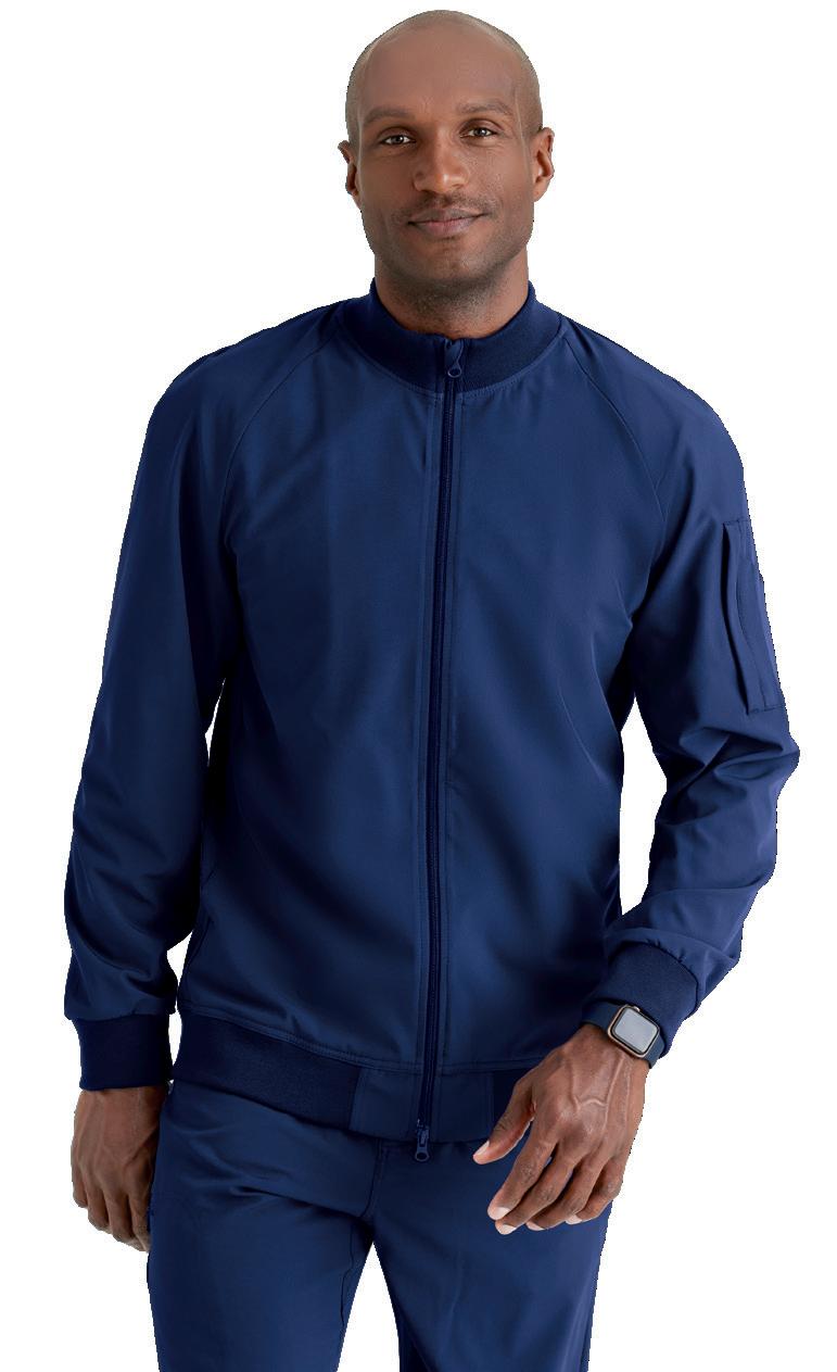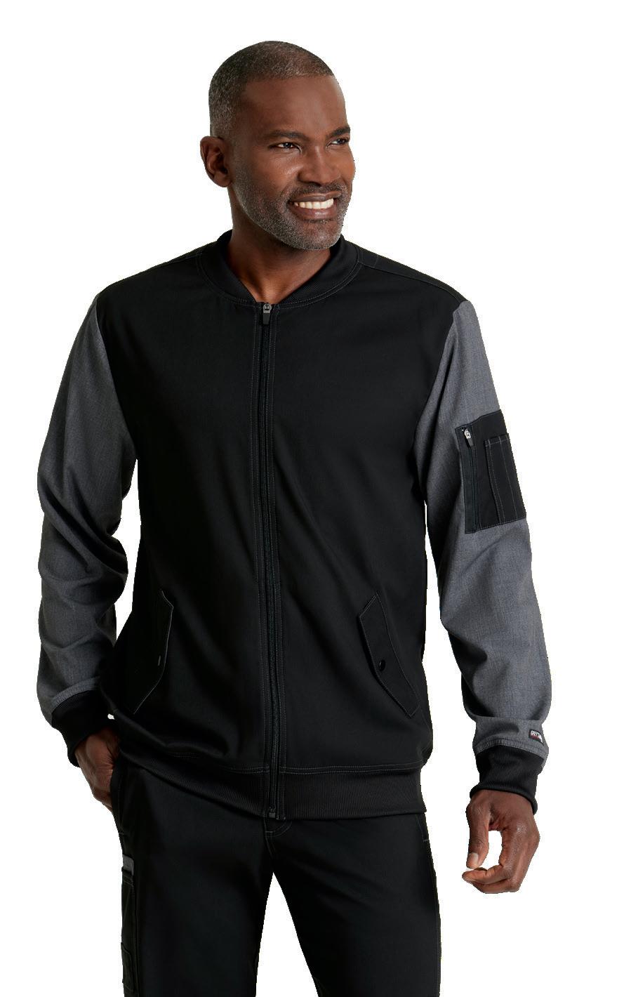 3-pocket bomber, knit neck and knit cuffs on raglan sleeves, 2-way zipper with cover, secure zip closure shoulder pocket with pen slots warm-up