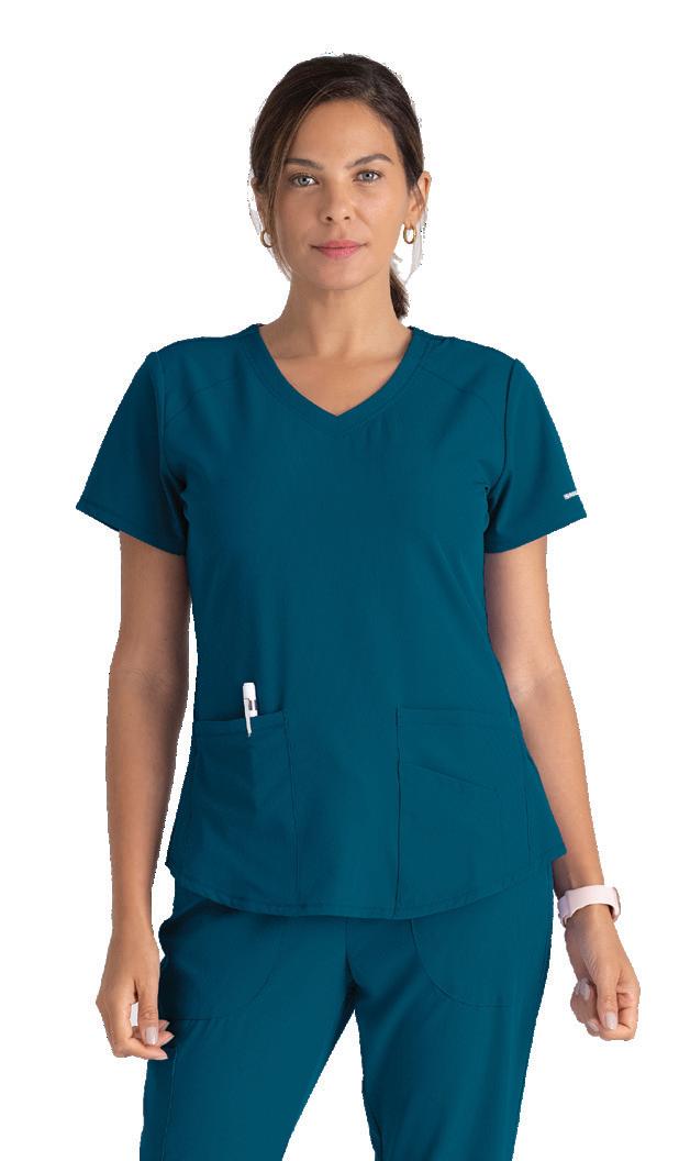 SKT147 Dignity Tuck-In Top 1-pocket, V-neck with contrast rib, front yoke seam with badge loop, single chest pocket, highlow hem tuck-in top