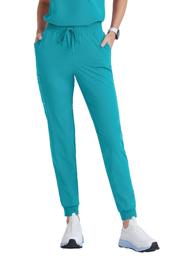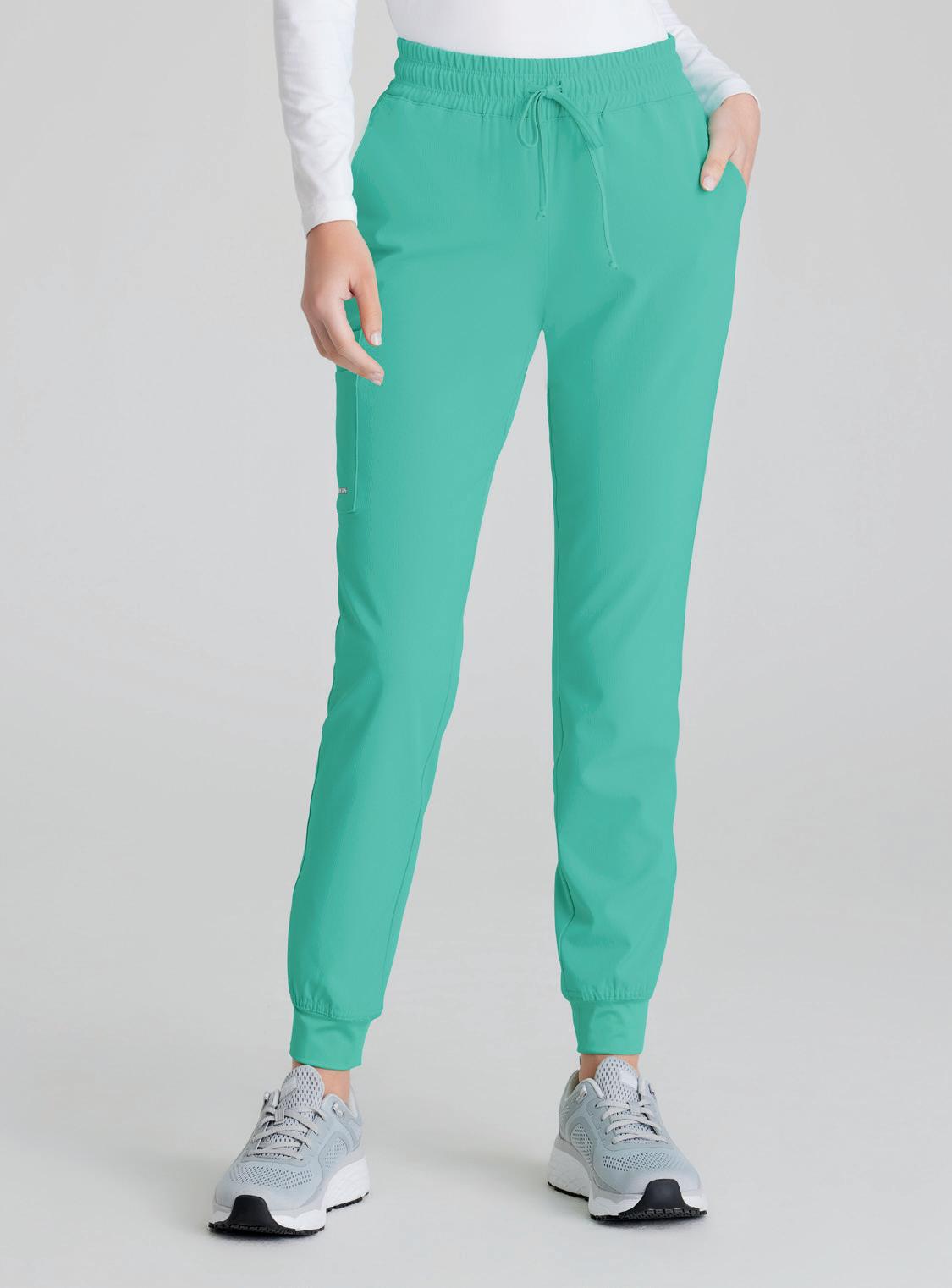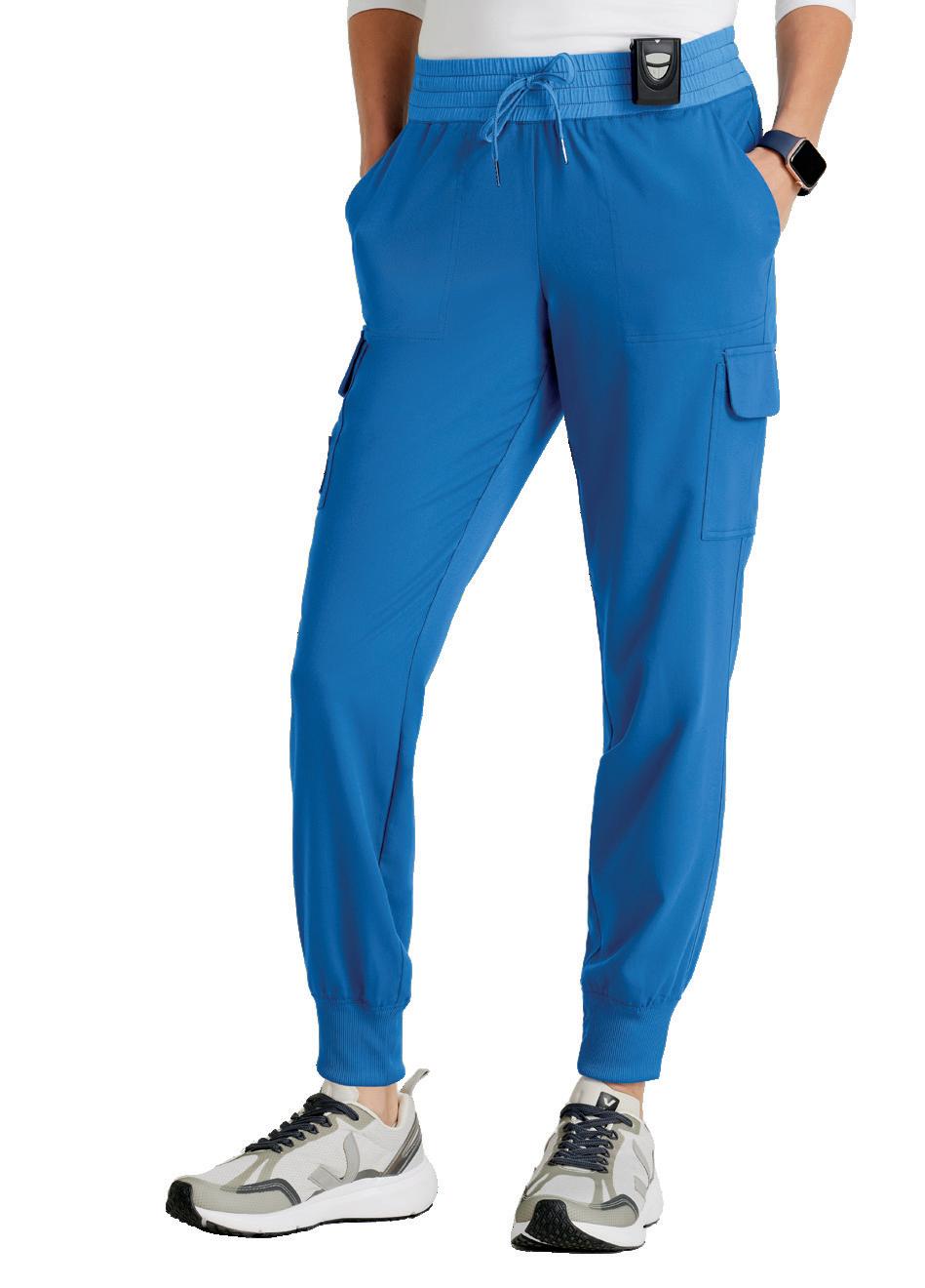 5-pocket, encased elastic waistband with drawcord, mid-rise, angled welt front pockets, double cargo pocket, back patch pocket, rib knit cuff jogger