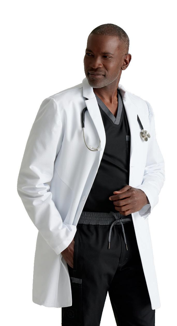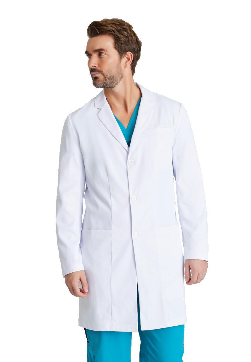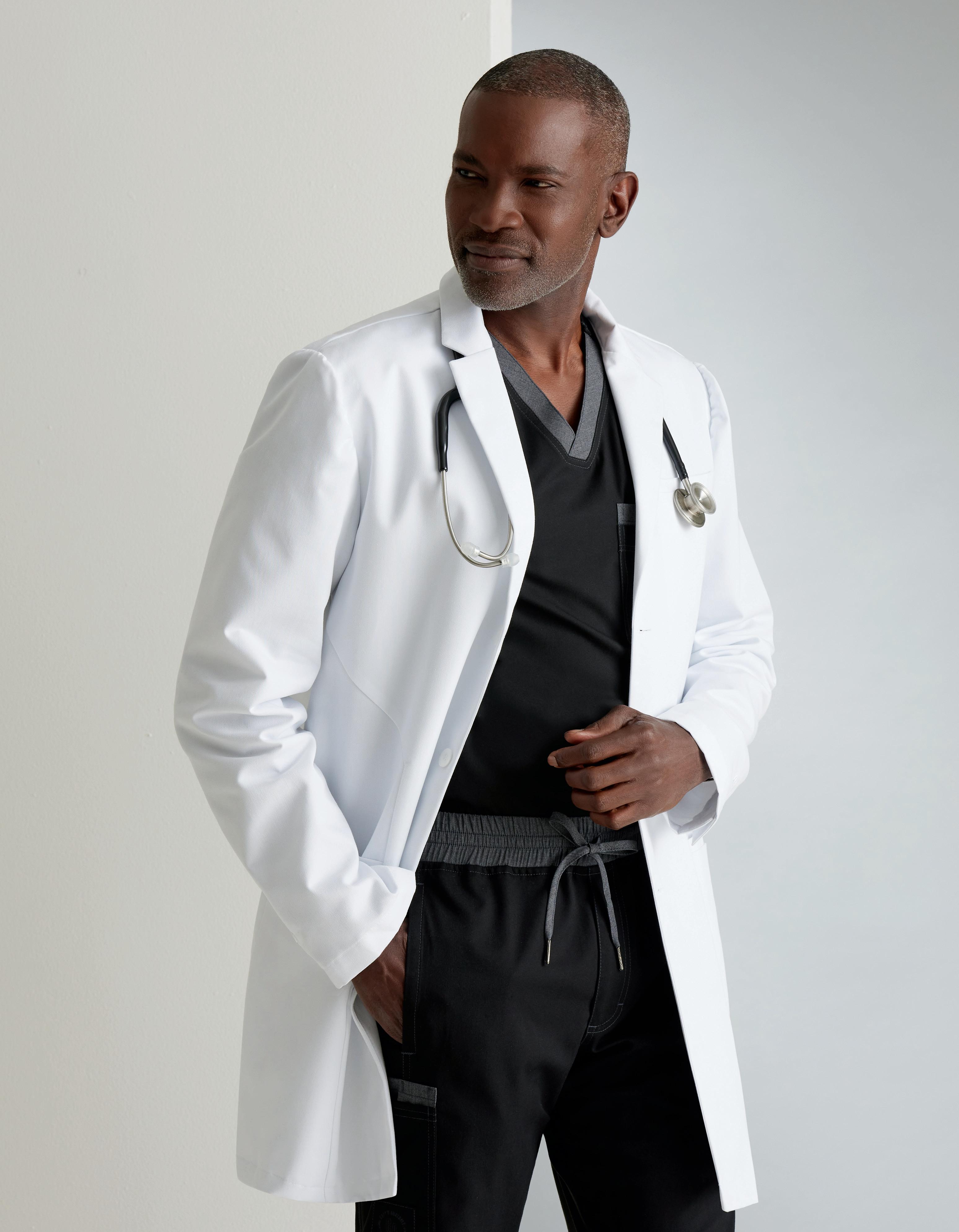 Men’s 5-pocket lab coat with tablet pockets, inside larger pockets, chest pocket with pen slots center back French seam, and extra length vent.