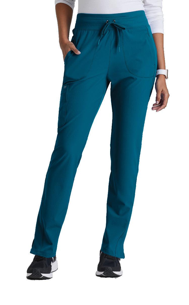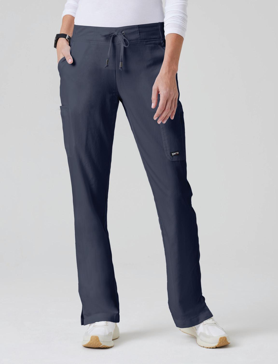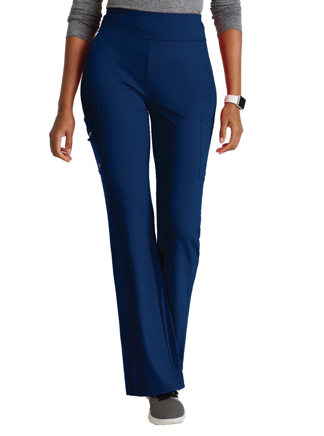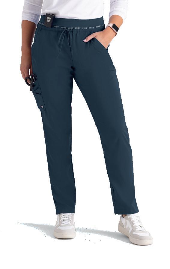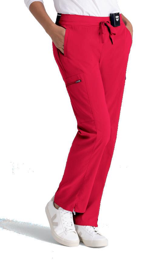 5-pocket, high-rise slim pant, flat front waistband with interior drawcord, dyedto-match zip front pockets, double cargo PDA pocket, back pocket pant