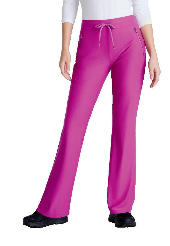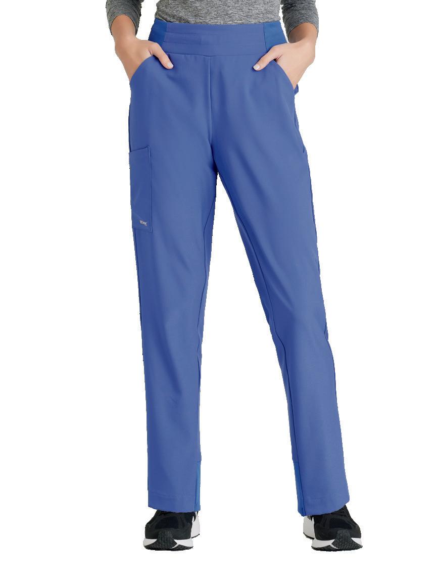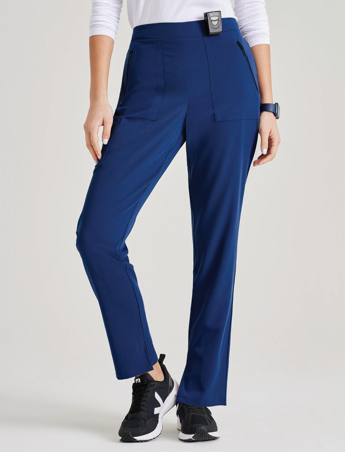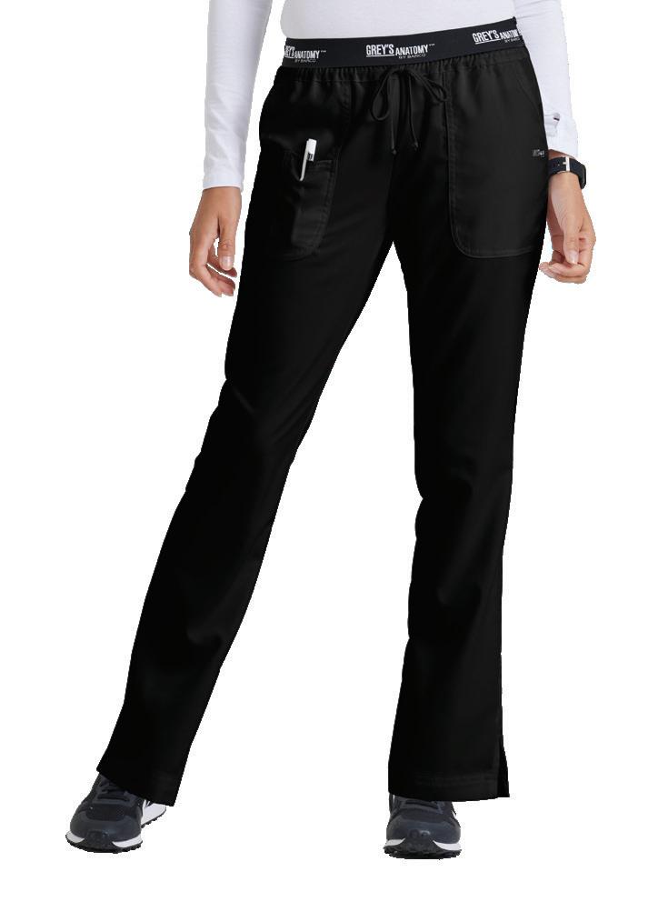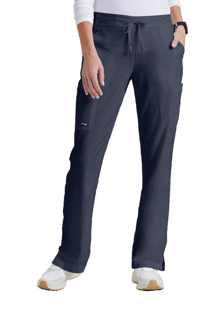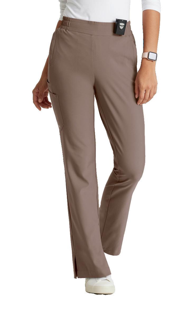 5-pocket, high-rise slim pant, flat front waistband with interior drawcord, dyedto-match zip front pockets, double cargo PDA pocket, back pocket pant