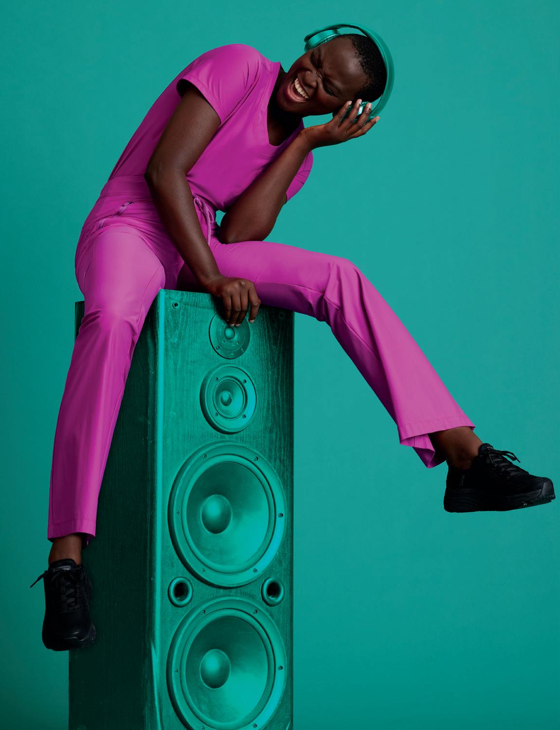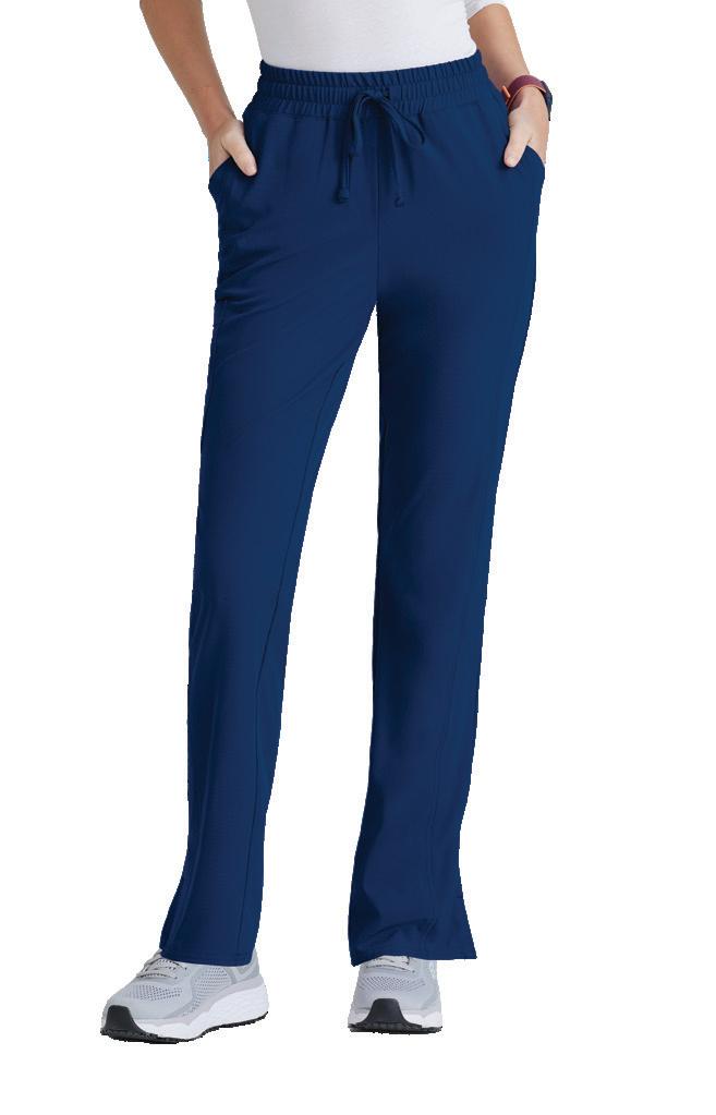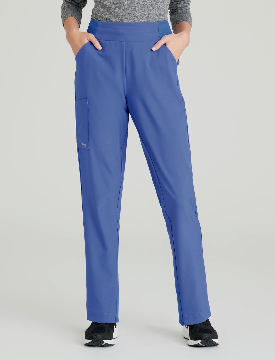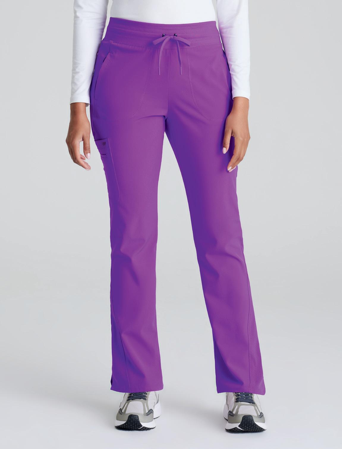 5-pocket, high-rise slim pant, flat front waistband with interior drawcord, dyedto-match zip front pockets, double cargo PDA pocket, back pocket pant
