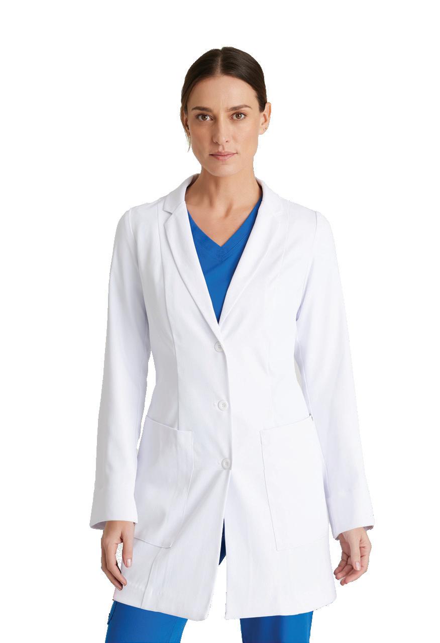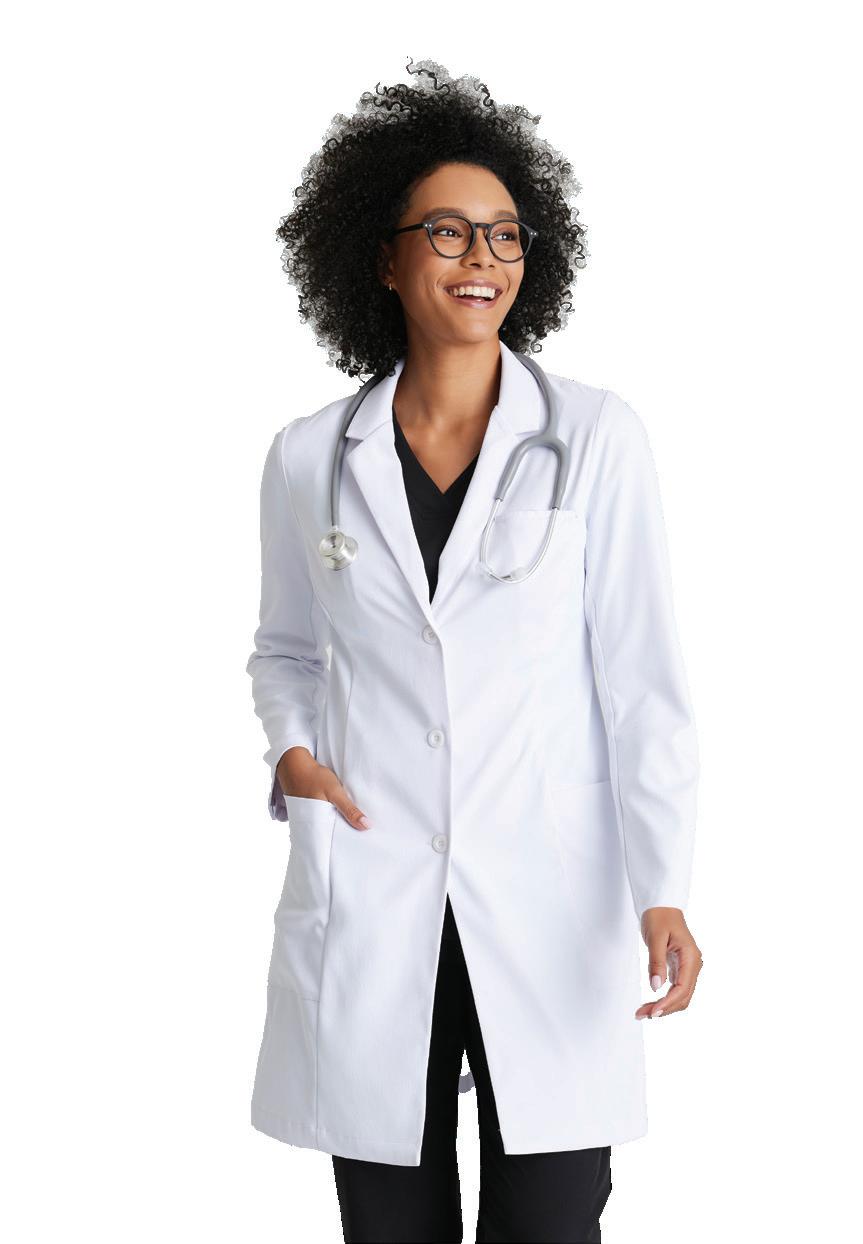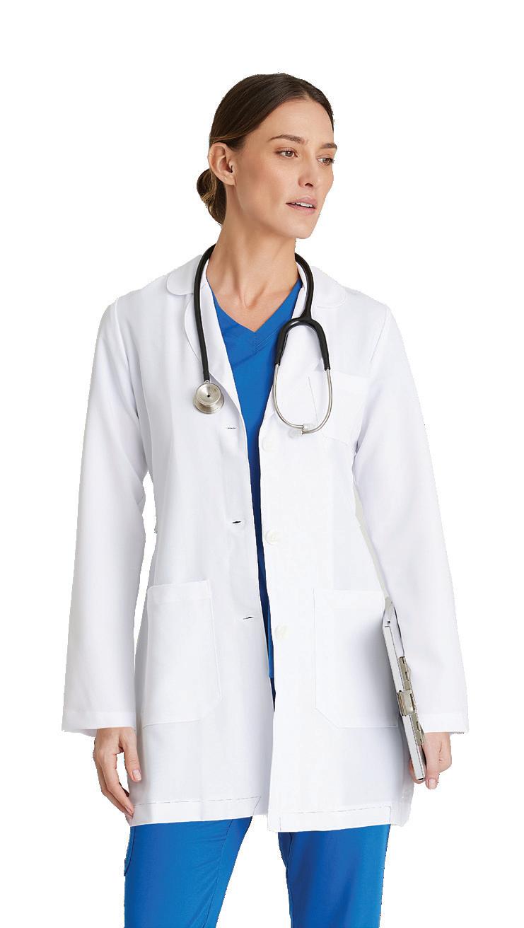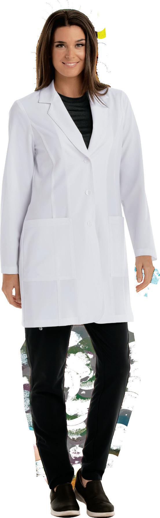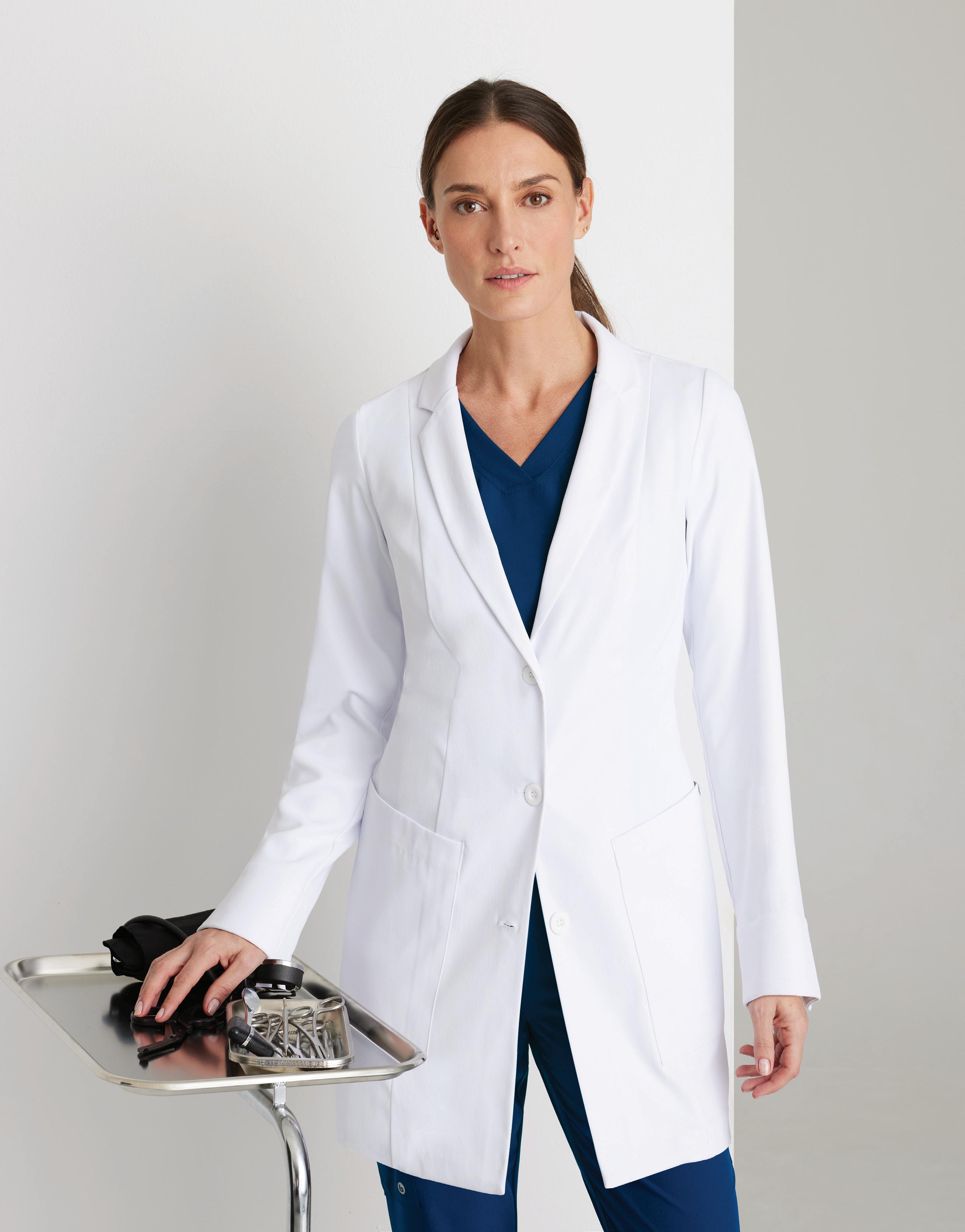 Women’s 4-pocket long sleeve lab coat, notch lapel, angled front yoke with on-seam pocket and pen slots, half-circle front princess seams with curved onseam tablet friendly pockets, and back princess seams with vents.