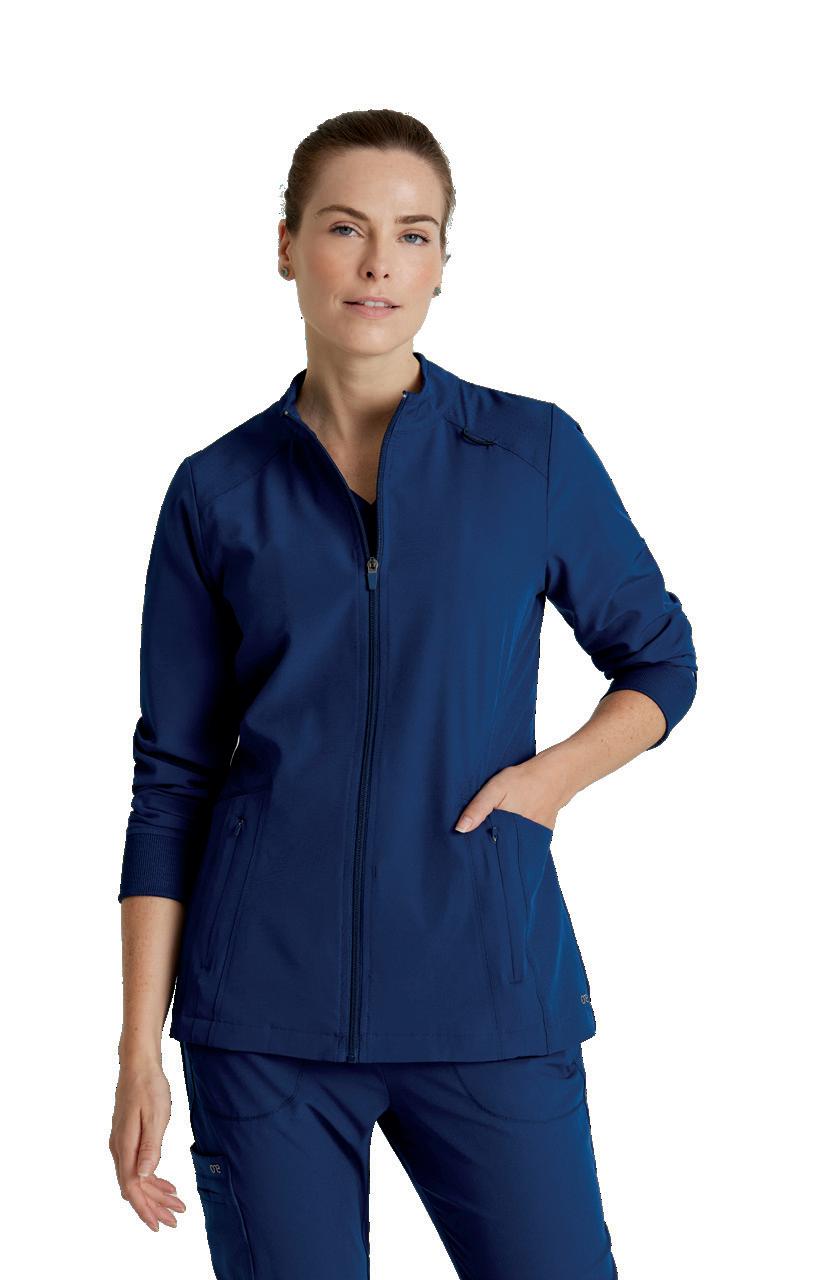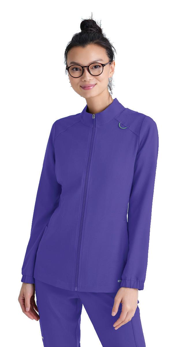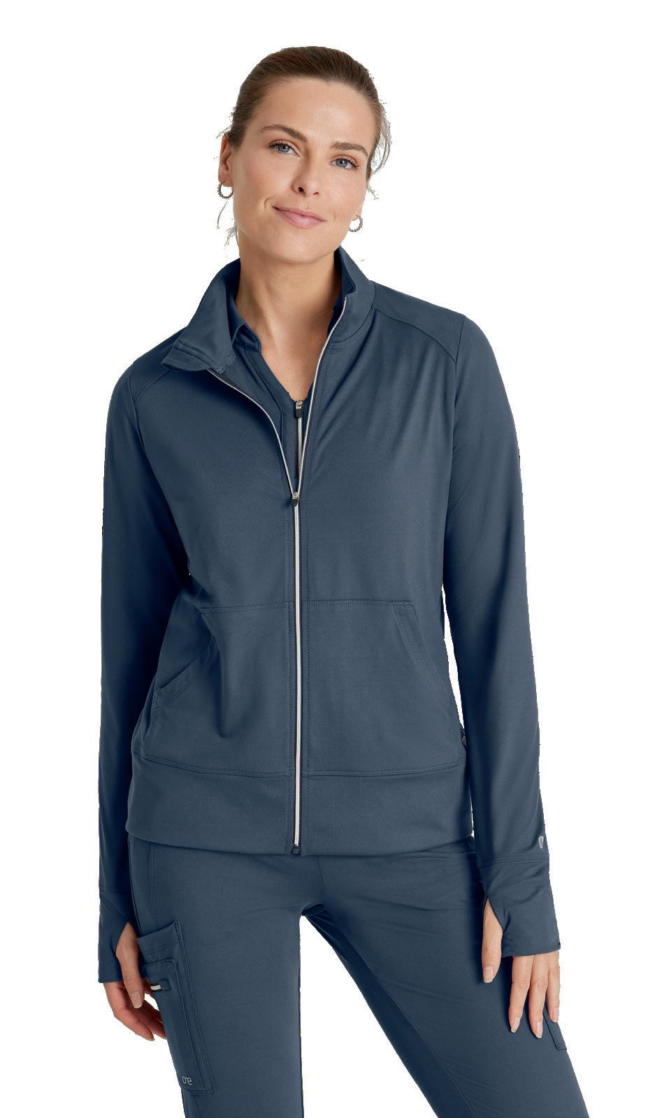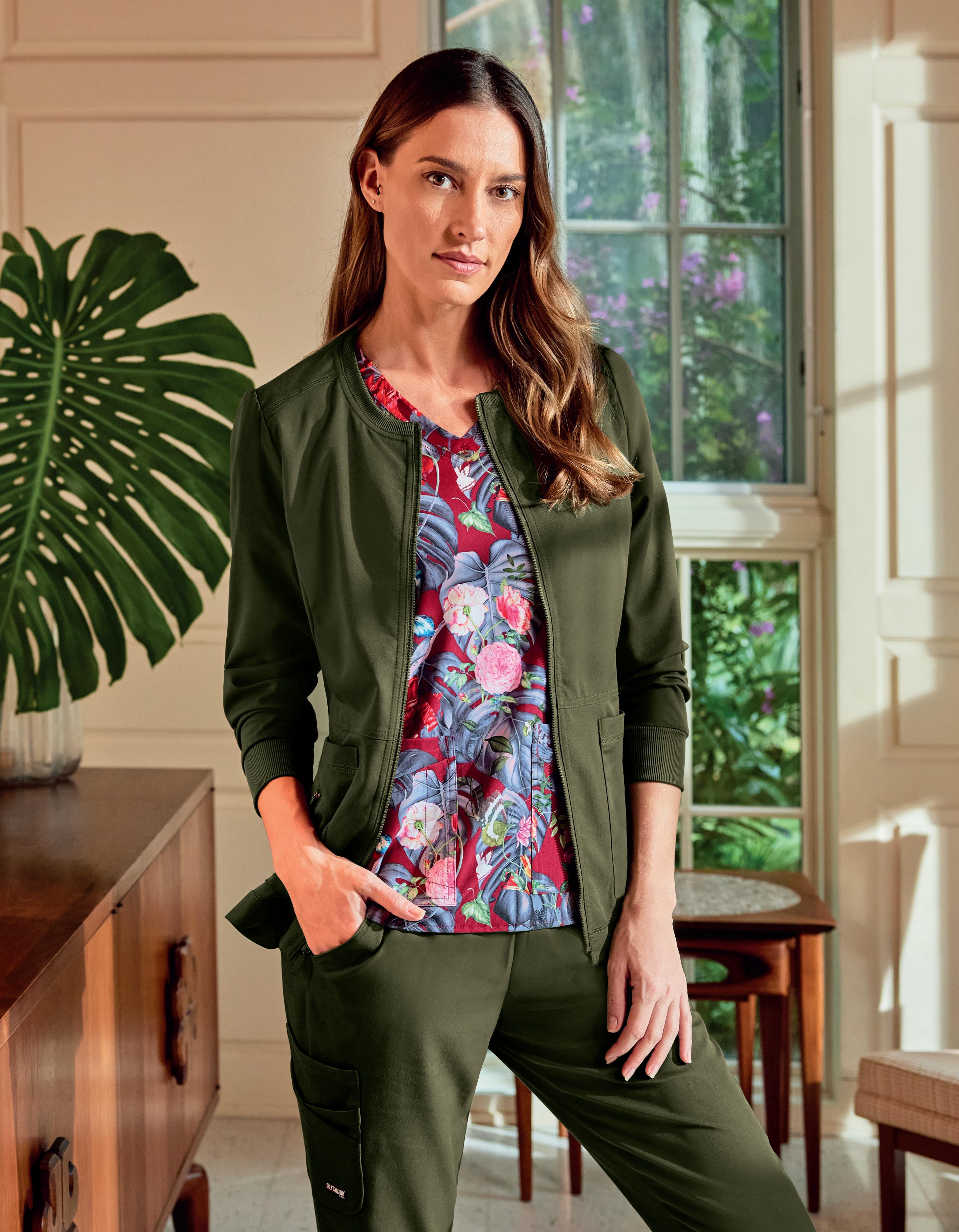 3-pocket banded collar, top-entry waist pockets, inside left front pocket, self waistband, encased elastic cuffs, zip-front warm-up