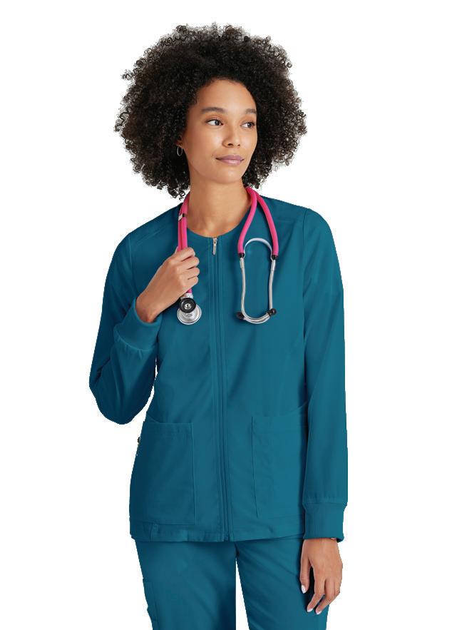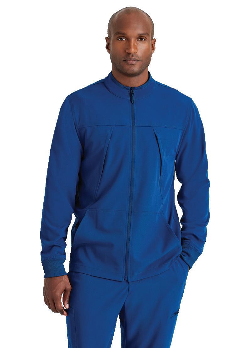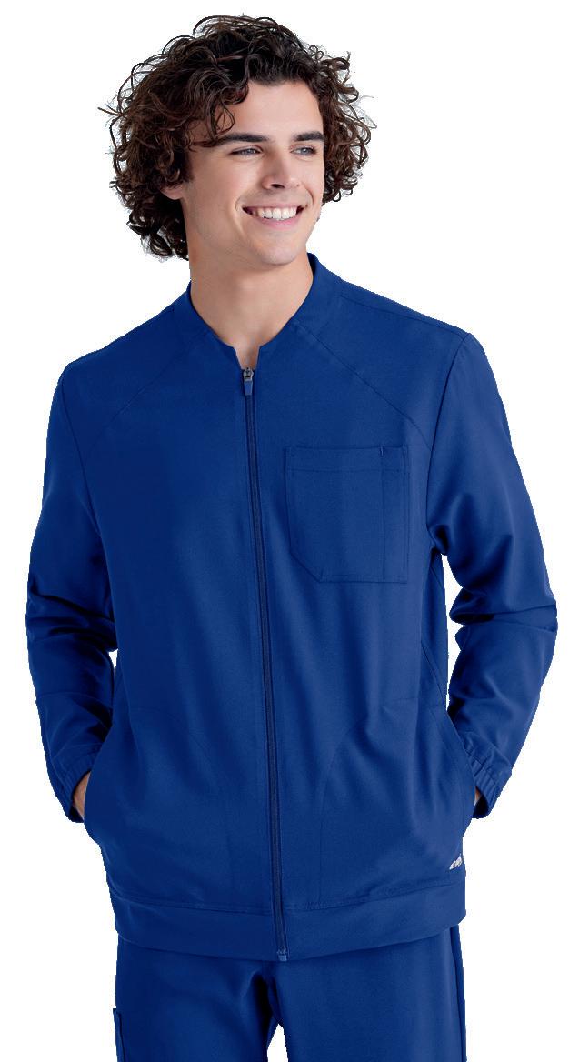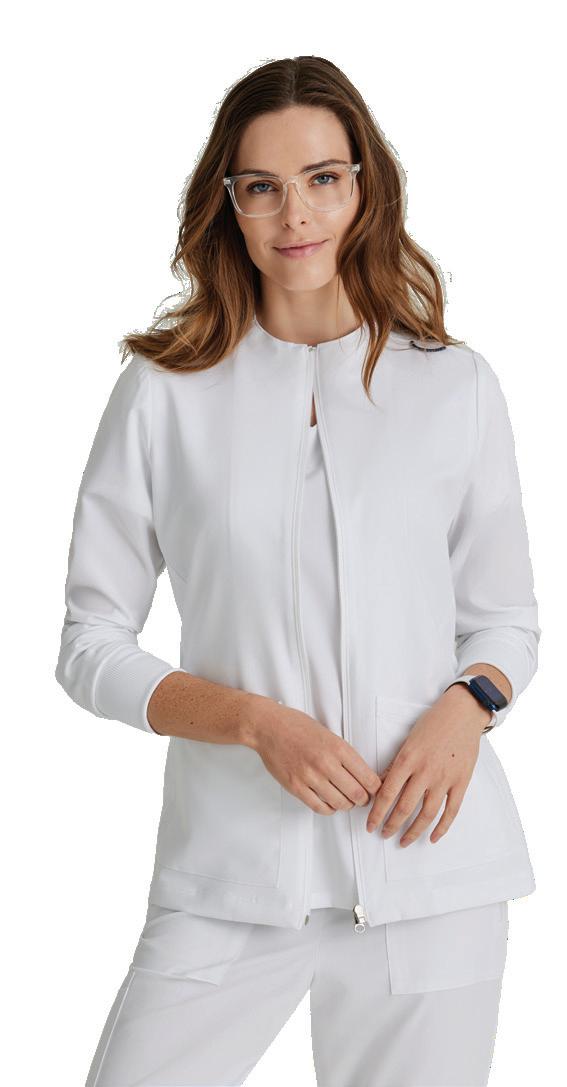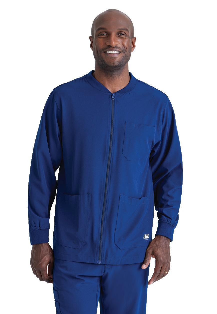 3-pocket banded collar, top-entry waist pockets, inside left front pocket, self waistband, encased elastic cuffs, zip-front warm-up